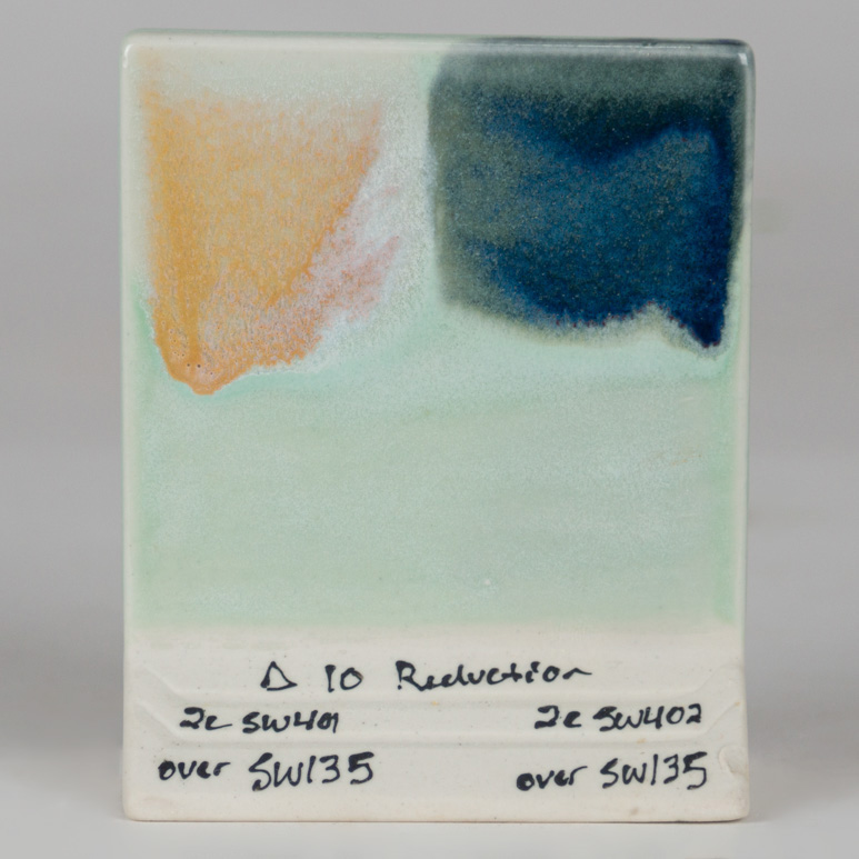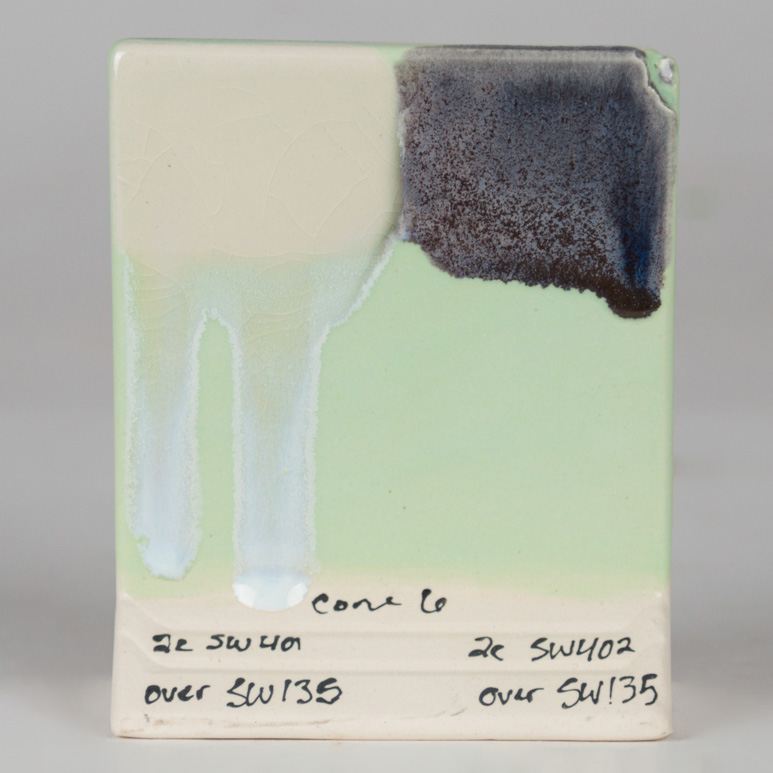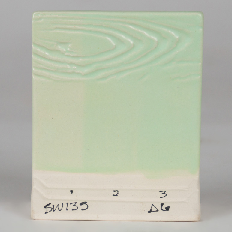 Cone 6: Wintergreen is a light-green, semi-opaque satin matte glaze at cone 6. Lighter coatings will allow body characteristics to appear through the glaze (especially on dark and speckled clay bodies). Use three coats to achieve the deepest opacity.