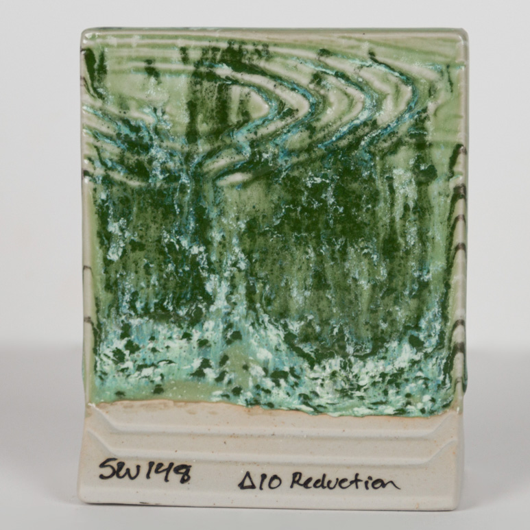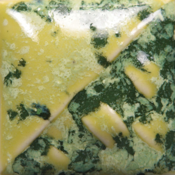 Cone 6 oxidation (larger image): Lime Shower is formulated to produce a vibrant chartreuse gloss glaze with dark green and white crystals. Light coats will produce a semi-transparent finish in the base glaze with fewer crystals. Use three or more coats to produce an opaque green float with more saturation of crystals. At cone 5, this glaze will produce a matte sepia finish with little breaking over texture.