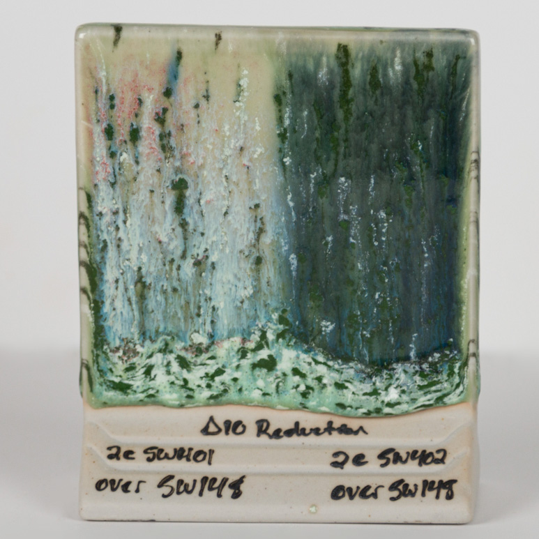 Chips shown are fired flat on a white clay body fired to cone 6 oxidation and cone 10 reduction. The choice of clay body, the thickness of glaze application, the firing process, and temperature will affect the fired results.