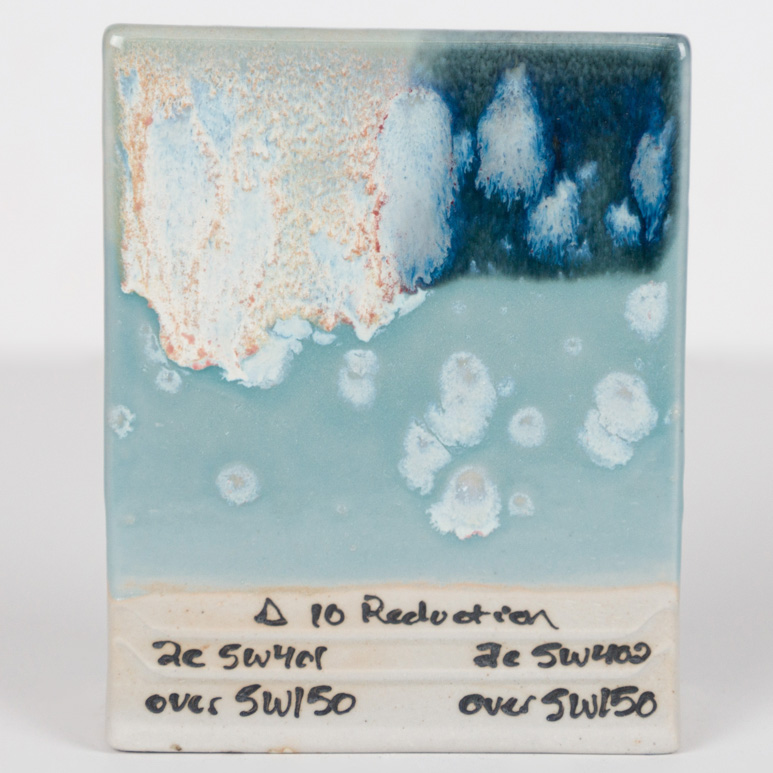 Chips shown are fired flat on a white clay body fired to cone 6 oxidation and cone 10 reduction. The choice of clay body, the thickness of glaze application, the firing process, and temperature will affect the fired results.