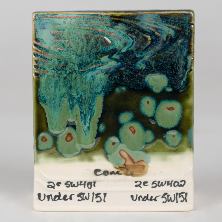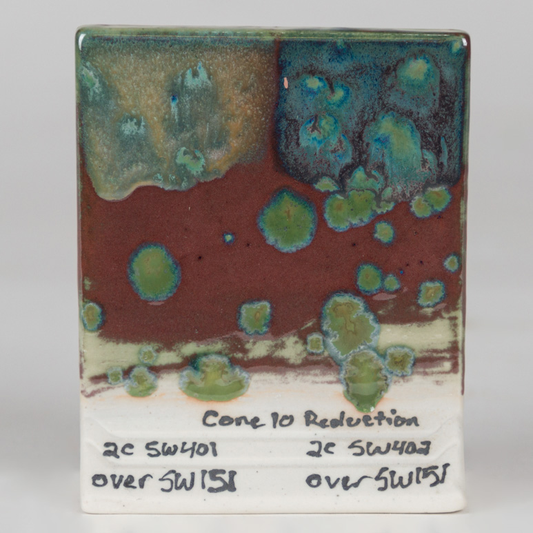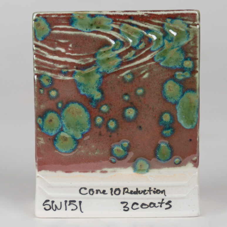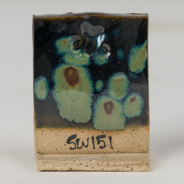 Chips shown are fired flat on a white clay body fired to cone 6 oxidation and cone 10 reduction. The choice of clay body, the thickness of glaze application, the firing process, and temperature will affect the fired results.