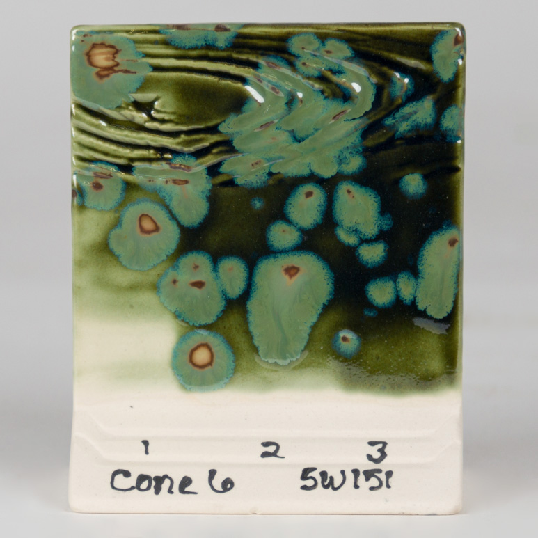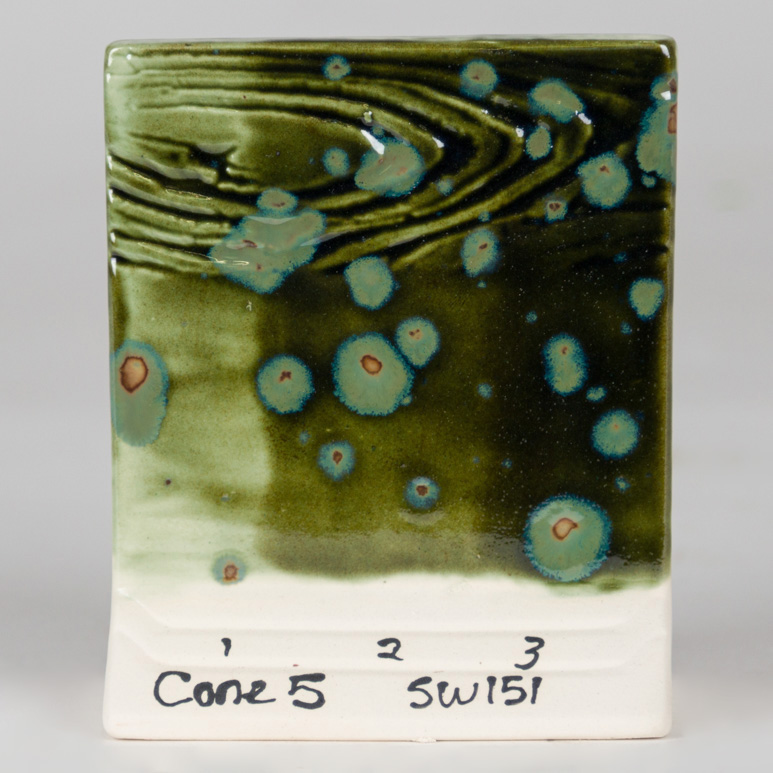 Cone 6 oxidation (larger image): Olive Float is a dark green gloss glaze that contains a light green crystal. It is a dazzling glaze that mimics crystalline glazes without the fuss of complicated kiln programing!