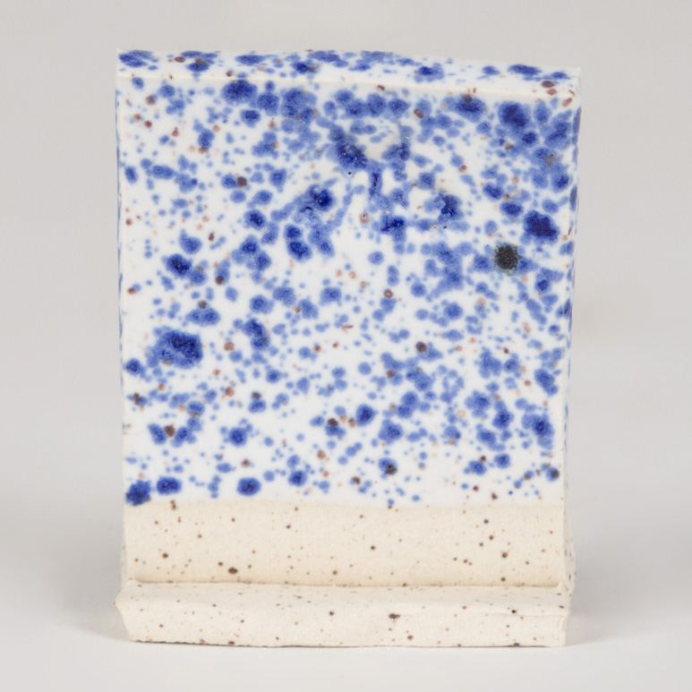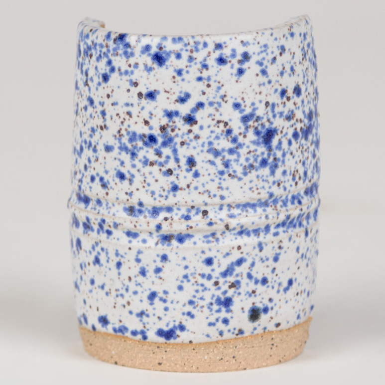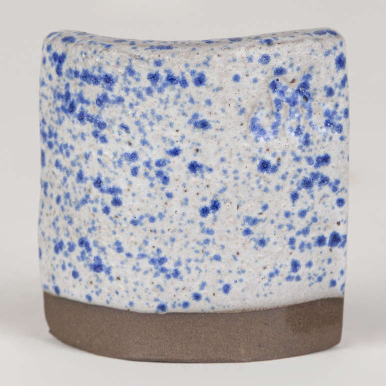 Cone 6: Blue Splatterware is a white, semi-matte glaze that contains a blue crystal. As the crystal melts it creates small blue blooms that cause the glaze to resemble the look of 19th century enamelware.