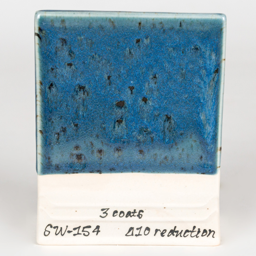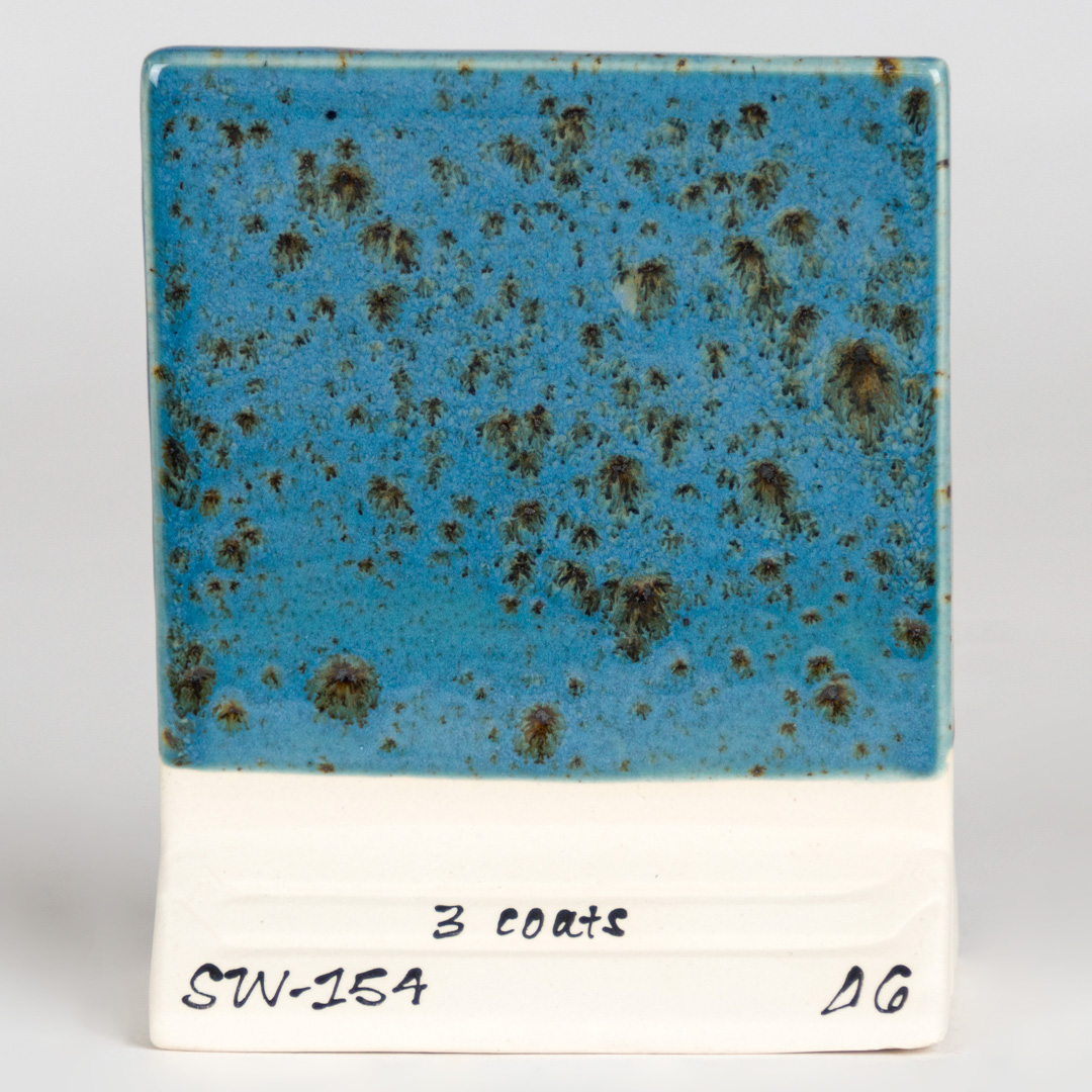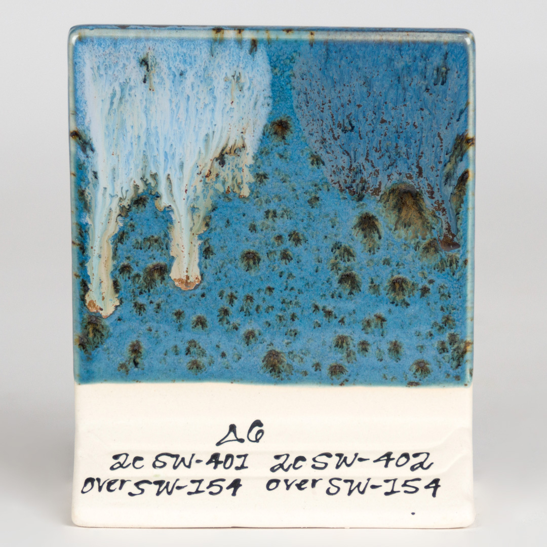 Stoneware crystal glazes are designed to expand upon the surface with dazzling bursts of color. Fired results will vary based on ware’s orientation. Crystals will settle to the bottom of the jar and will need a good mixing prior to initial use. Re-stir between each coat. Stir with palette knife or other unpainted tool. Avoid placing crystals near the bottom third of a vertical piece as they may cause additional movement during firing. Crystals will flow more than the base glaze. While the glaze is wet, use your fan brush to redistribute the crystals to achieve balanced coverage. Over-application or heavy deposition of the crystals can cause pinholing or running. When storing a crystal glaze, you may consider storing upside down to facilitate crystal dispersion on the next use.