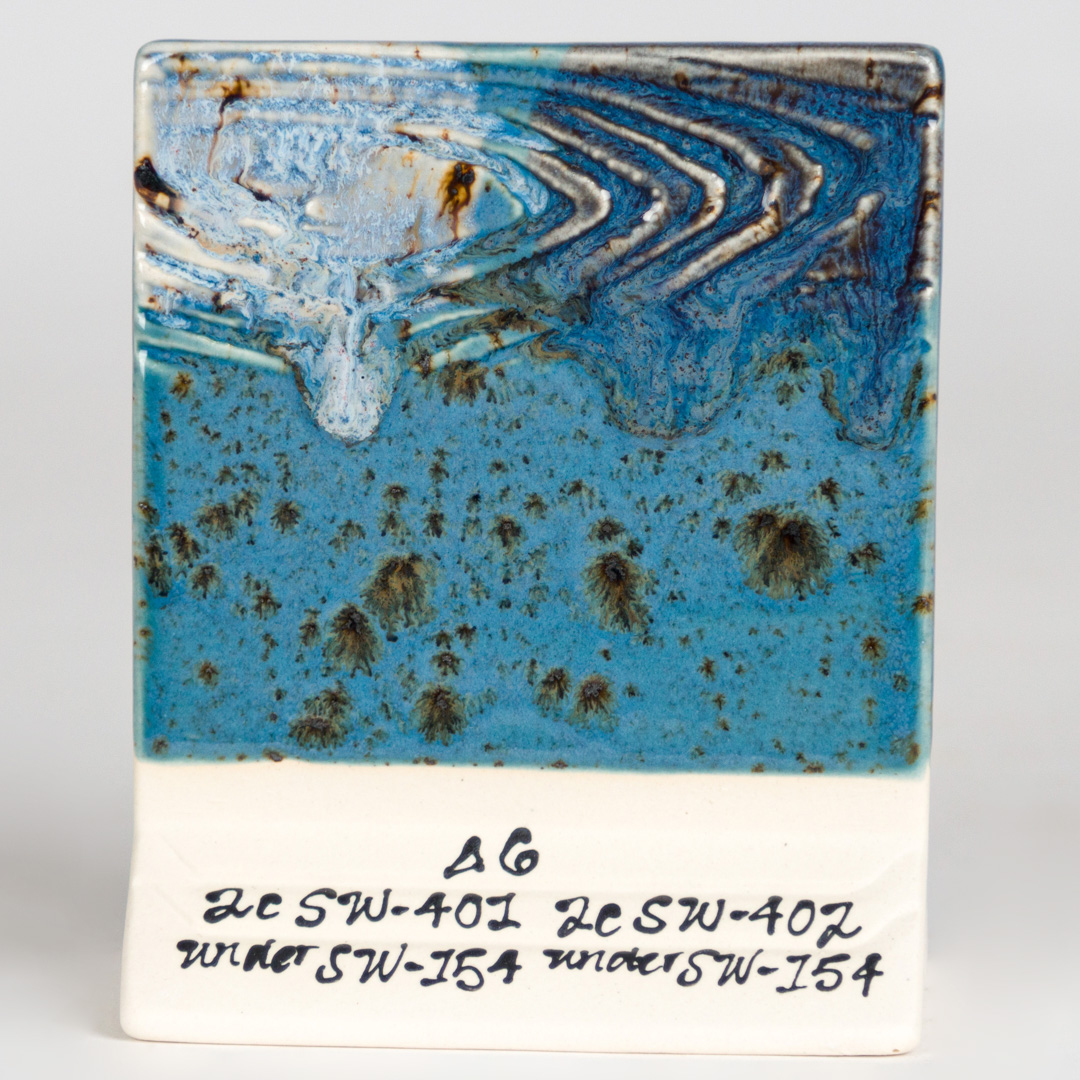 Cone 6: Shipwreck is an aquamarine gloss glaze that contains an iron crystal. As the crystal melts, a small iron speck appears. The glaze appears mysterious like underwater footage.