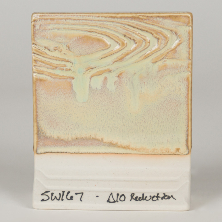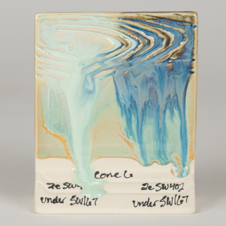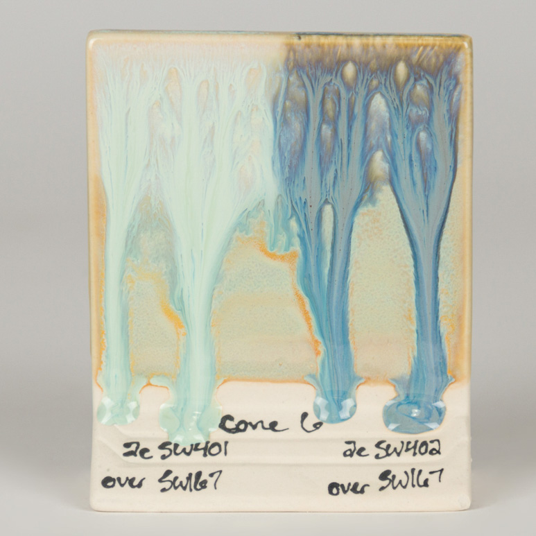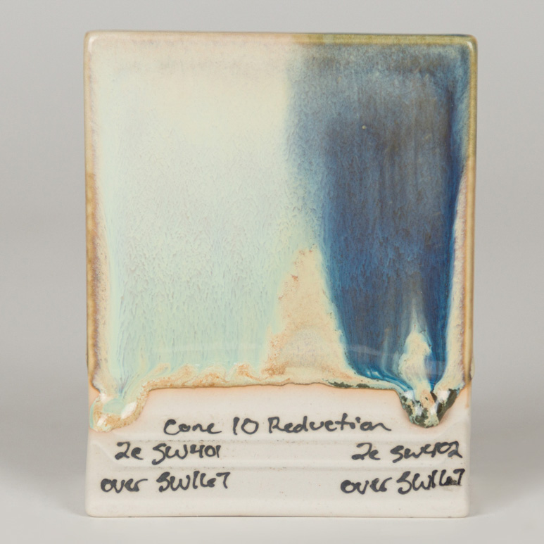 Chips shown are fired flat on a white clay body fired to cone 6 oxidation and cone 10 reduction. The choice of clay body, the thickness of glaze application, the firing process, and temperature will affect the fired results.