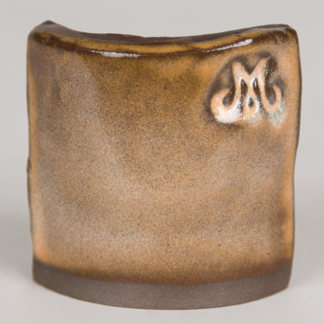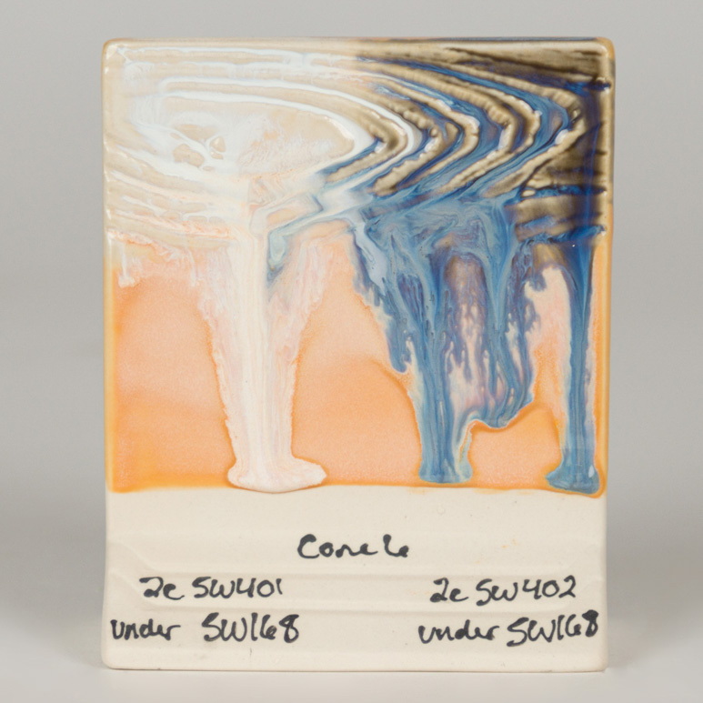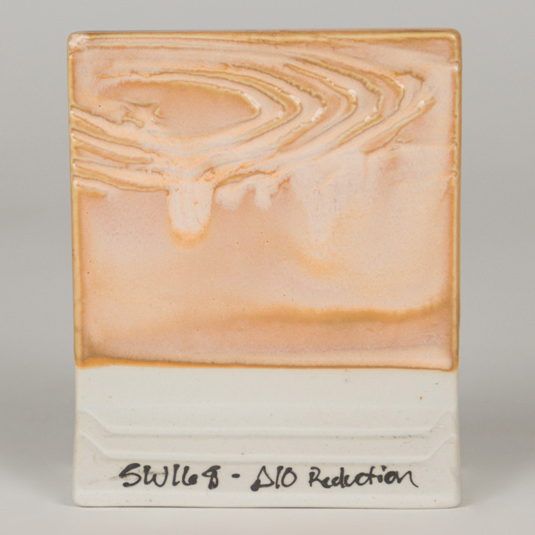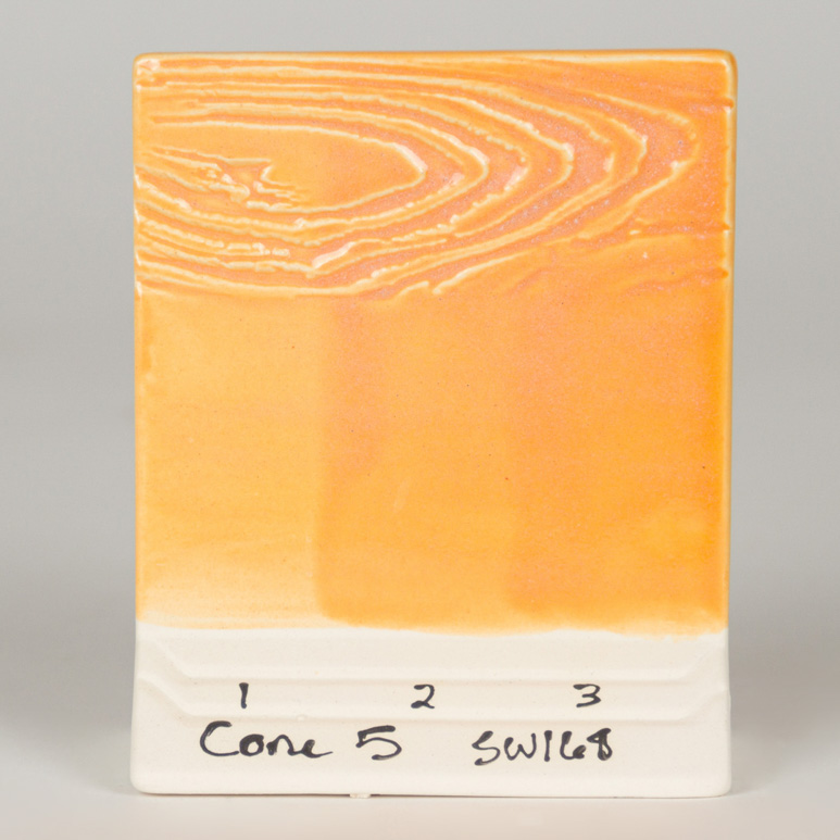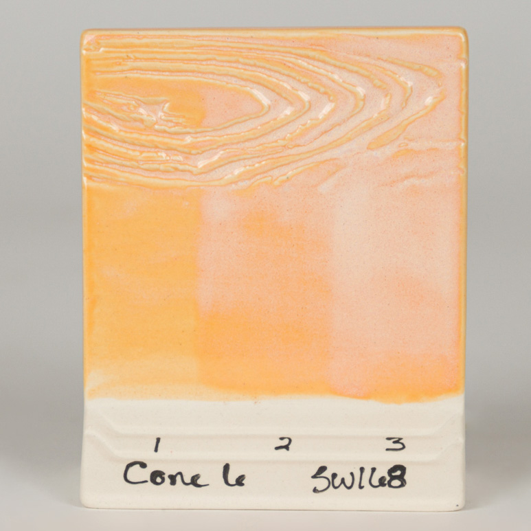 Cone 6 oxidation (larger image): Coral Sands is a semi-opaque gloss glaze that displays shades of orange, yellow, and pink. The variation of glaze depends on application. The thicker the application, the more homogenous the color will be. The glaze will break translucent where thinner and pool darker around surface textures.