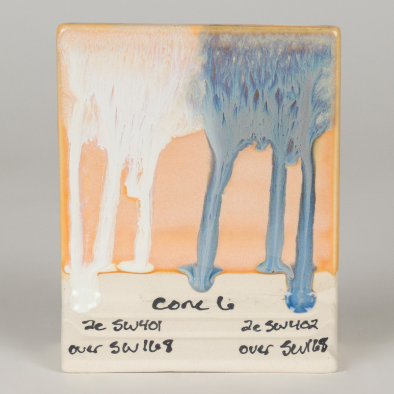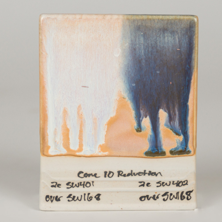 Chips shown are fired flat on a white clay body fired to cone 6 oxidation and cone 10 reduction. The choice of clay body, the thickness of glaze application, the firing process, and temperature will affect the fired results.