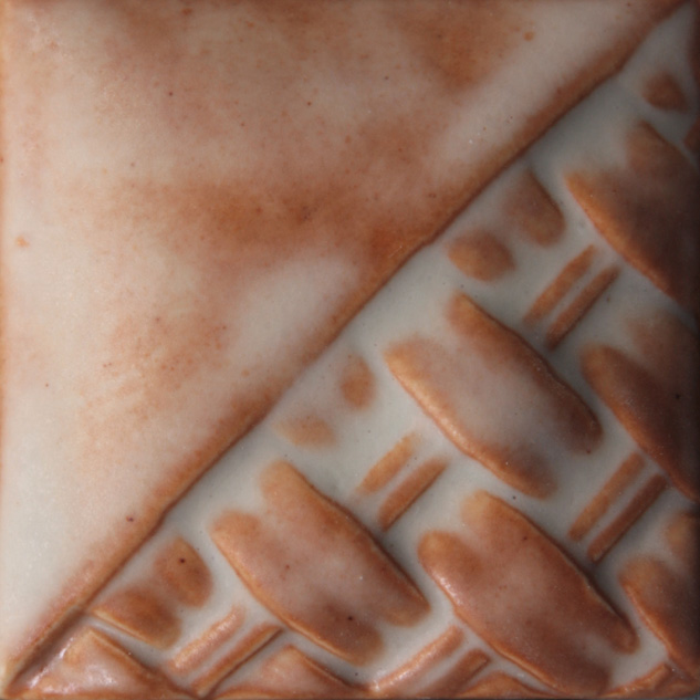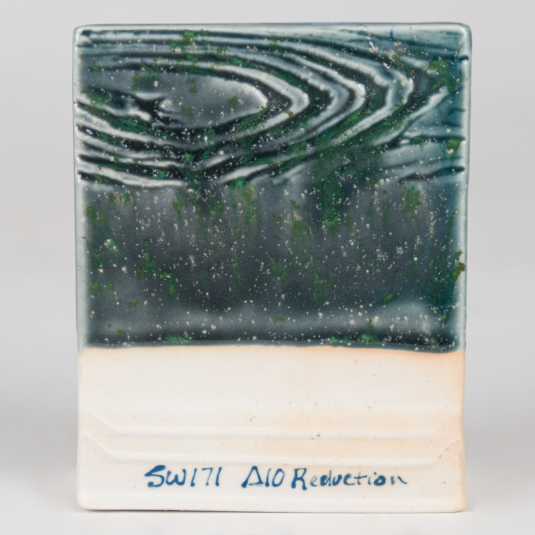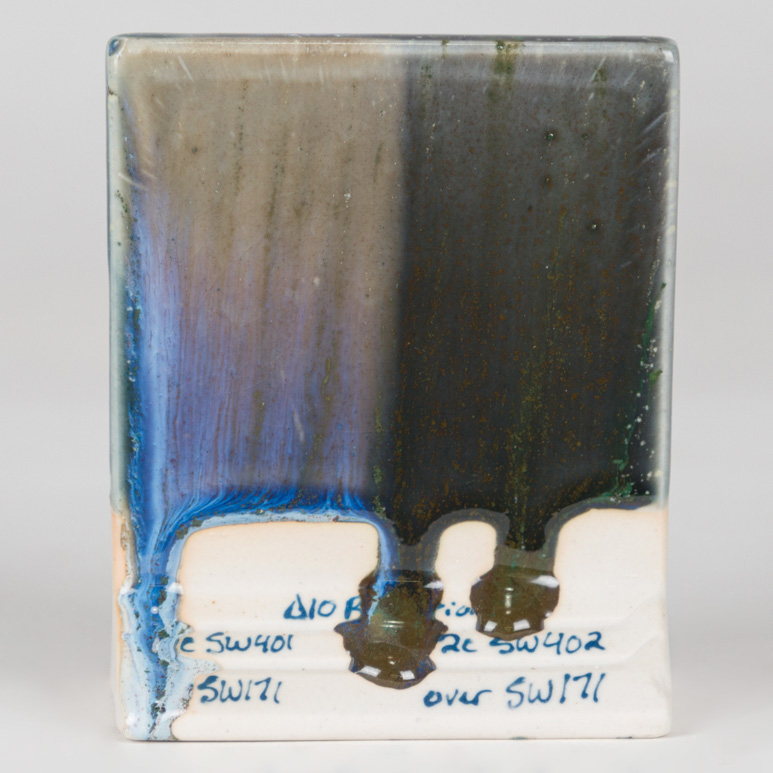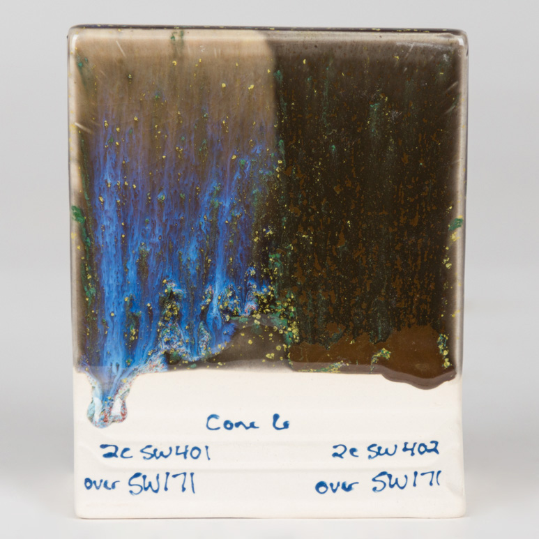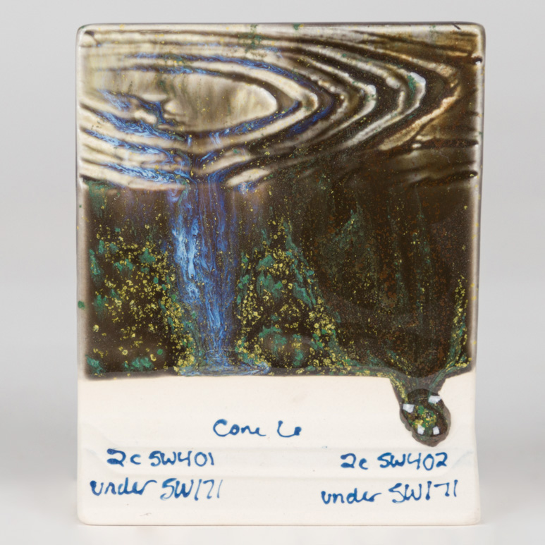 Cone 10: Base glaze turns dark blue, yellow crystals turn white and green crystals turn blue.