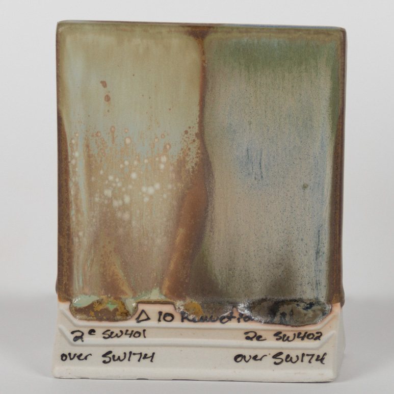 Chips shown are fired flat on a white clay body fired to cone 6 oxidation and cone 10 reduction. The choice of clay body, the thickness of glaze application, the firing process, and temperature will affect the fired results.