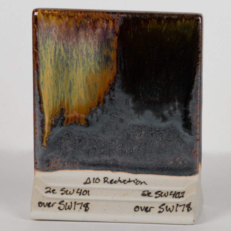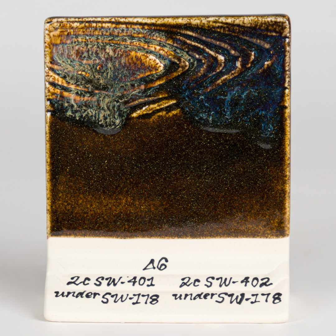 Chips shown are fired flat on a white clay body fired to cone 6 oxidation and cone 10 reduction. The choice of clay body, the thickness of glaze application, the firing process, and temperature will affect the fired results.
