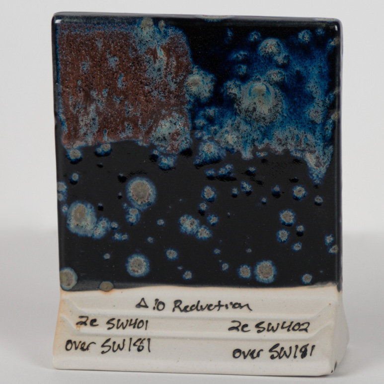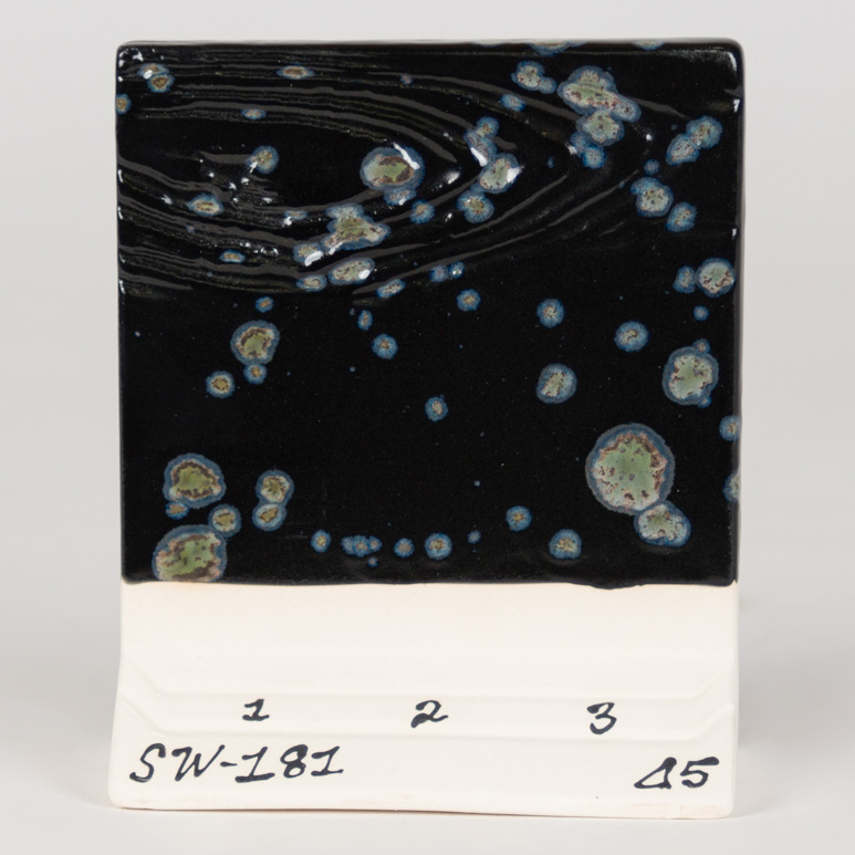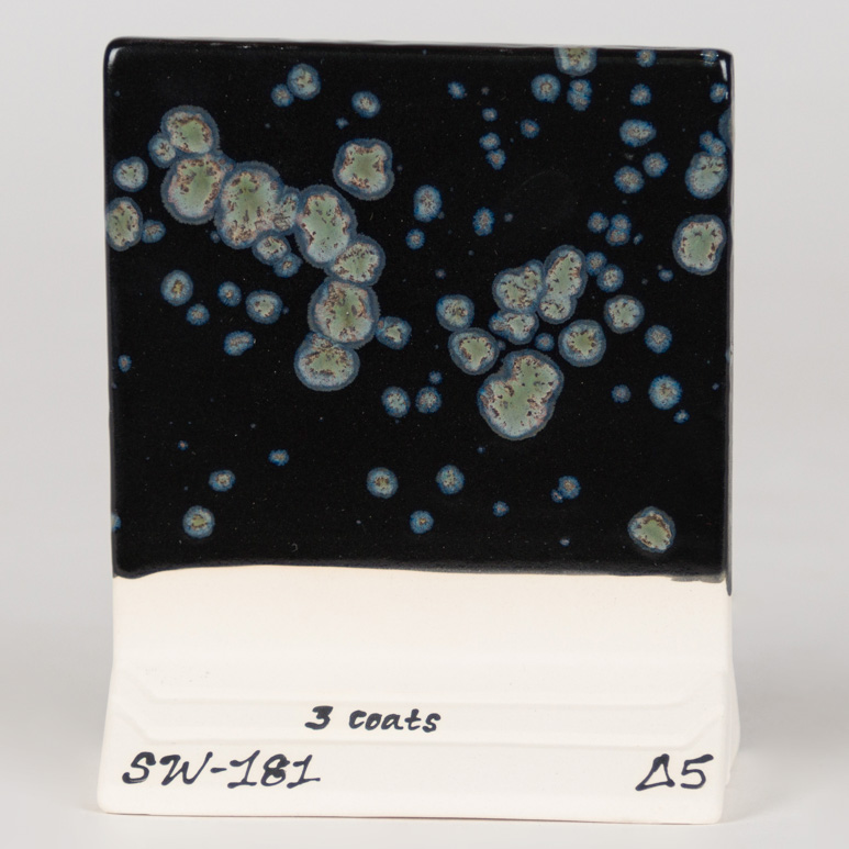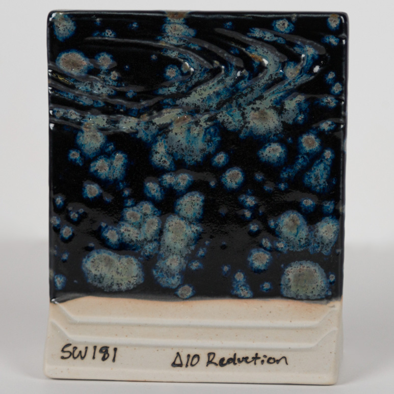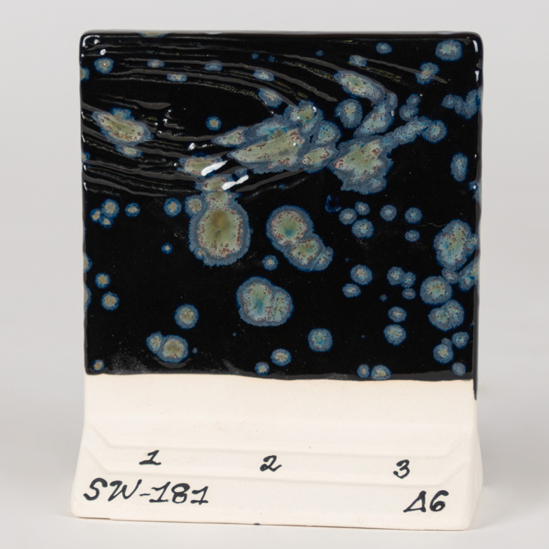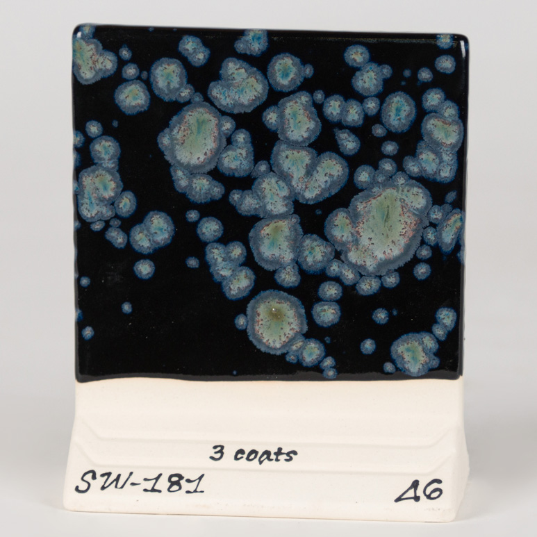 Stoneware crystal glazes are designed to expand upon the surface with dazzling bursts of color. Fired results will vary based on ware’s orientation. Crystals will settle to the bottom of the jar and will need a good mixing prior to initial use. Re-stir between each coat. Stir with palette knife or other unpainted tool. Avoid placing crystals near the bottom third of a vertical piece as they may cause additional movement during firing. Crystals will flow more than the base glaze. While the glaze is wet, use your fan brush to redistribute the crystals to achieve balanced coverage. Over-application or heavy deposition of the crystals can cause pinholing or running. When storing a crystal glaze, you may consider storing upside down to facilitate crystal dispersion on the next use.