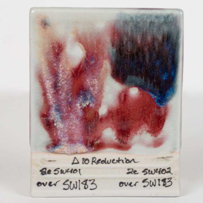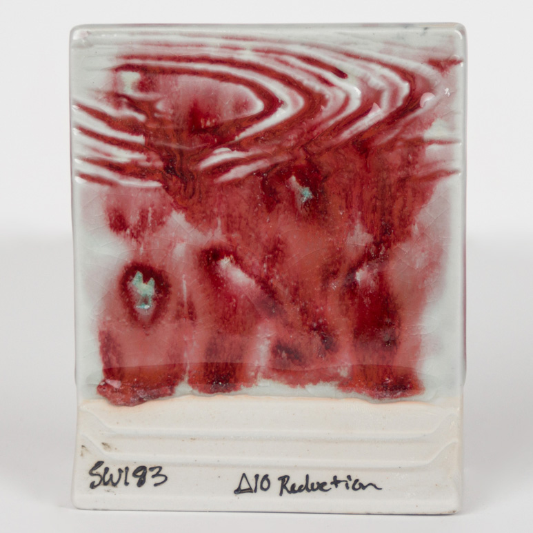 Chips shown are fired flat on a white clay body fired to cone 6 oxidation and cone 10 reduction. The choice of clay body, the thickness of glaze application, the firing process, and temperature will affect the fired results.