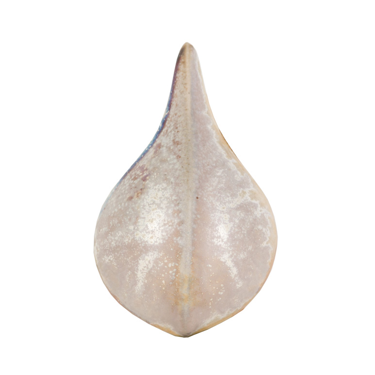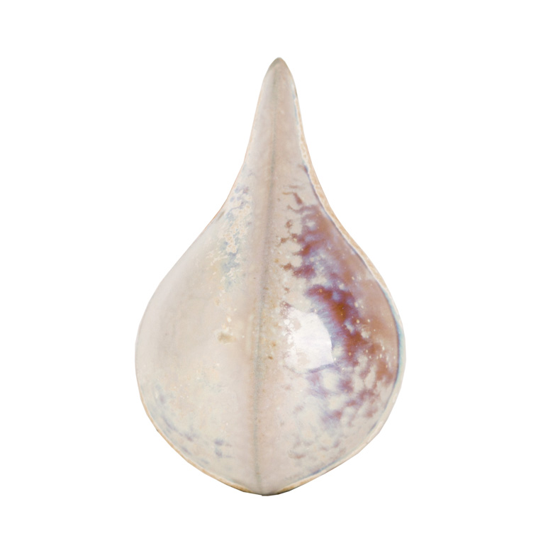 Cone 10 reduction (small photo): Glaze shifts to a glossy, variegated lavender purple with white micro-crystallization. Breaks blue/grey over texture. Enhanced mobility.