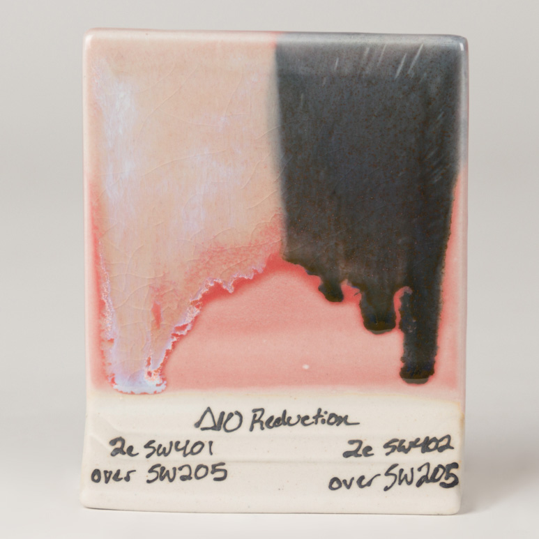 Chips shown are fired flat on a white clay body fired to cone 6 oxidation and cone 10 reduction. The choice of clay body, the thickness of glaze application, the firing process, and temperature will affect the fired results.