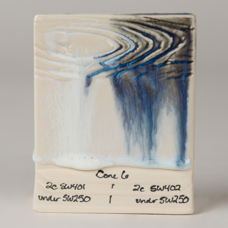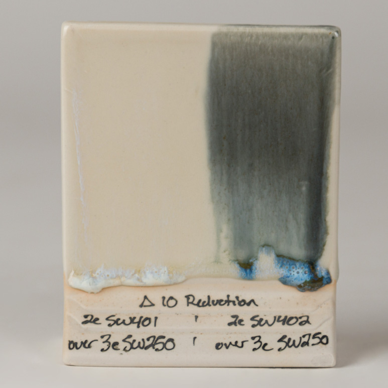 Chips shown are fired flat on a white clay body fired to cone 6 oxidation and cone 10 reduction. The choice of clay body, the thickness of glaze application, the firing process, and temperature will affect the fired results.
