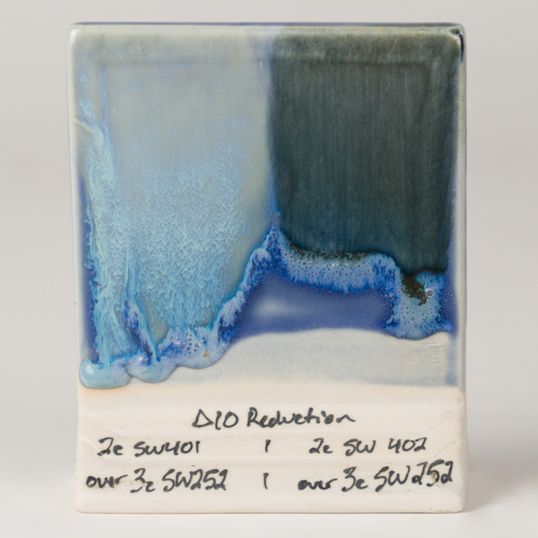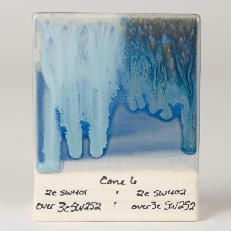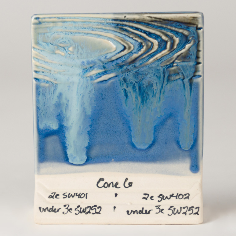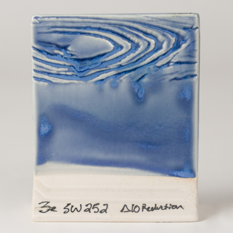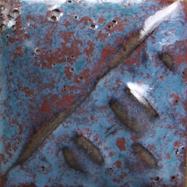 Cone 6: Blue Opal is a medium blue semi-transparent to fully opaque gloss glaze. Thinner applications create a transparent blue haze; thicker coatings produce an