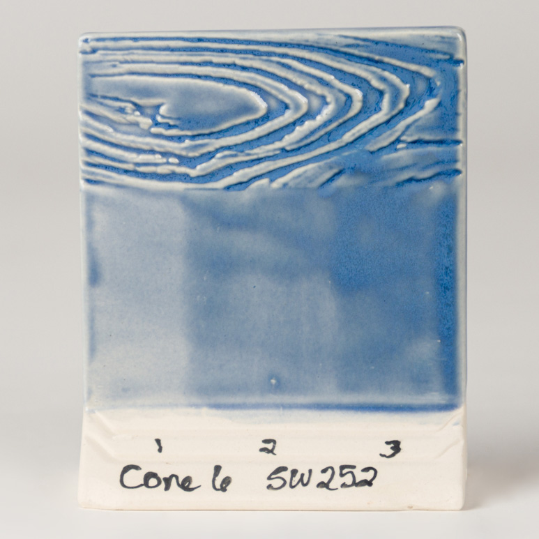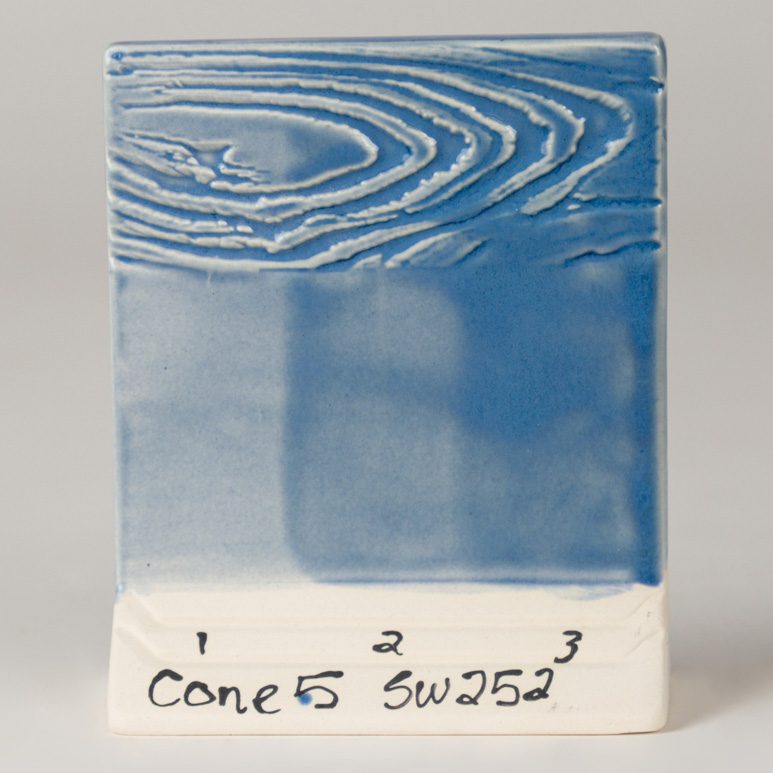 TIP: Light applications on brown and buff bodies will produce a transparent green-blue gloss finish. Thinner application will provide a glossy transparent finish. Thicker application will provide light blue floating. Surface decoration will be visible under the glaze, but if you apply the glaze thick, it could blur your image.