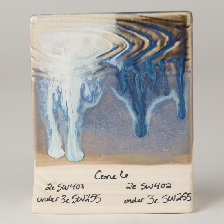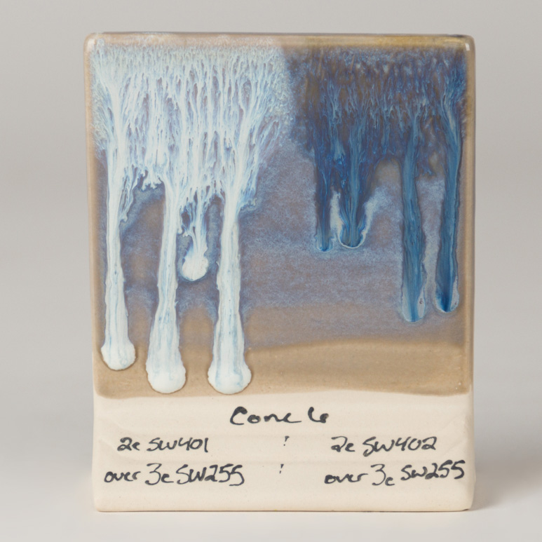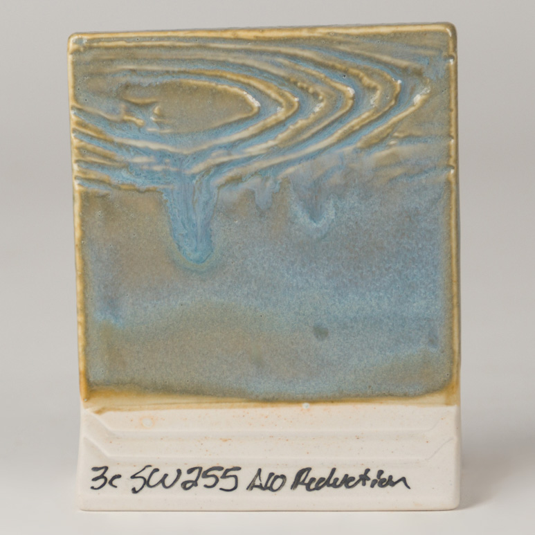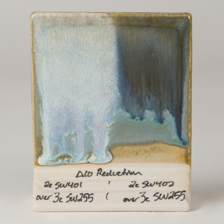 Chips shown are fired flat on a white clay body fired to cone 6 oxidation and cone 10 reduction. The choice of clay body, the thickness of glaze application, the firing process, and temperature will affect the fired results.