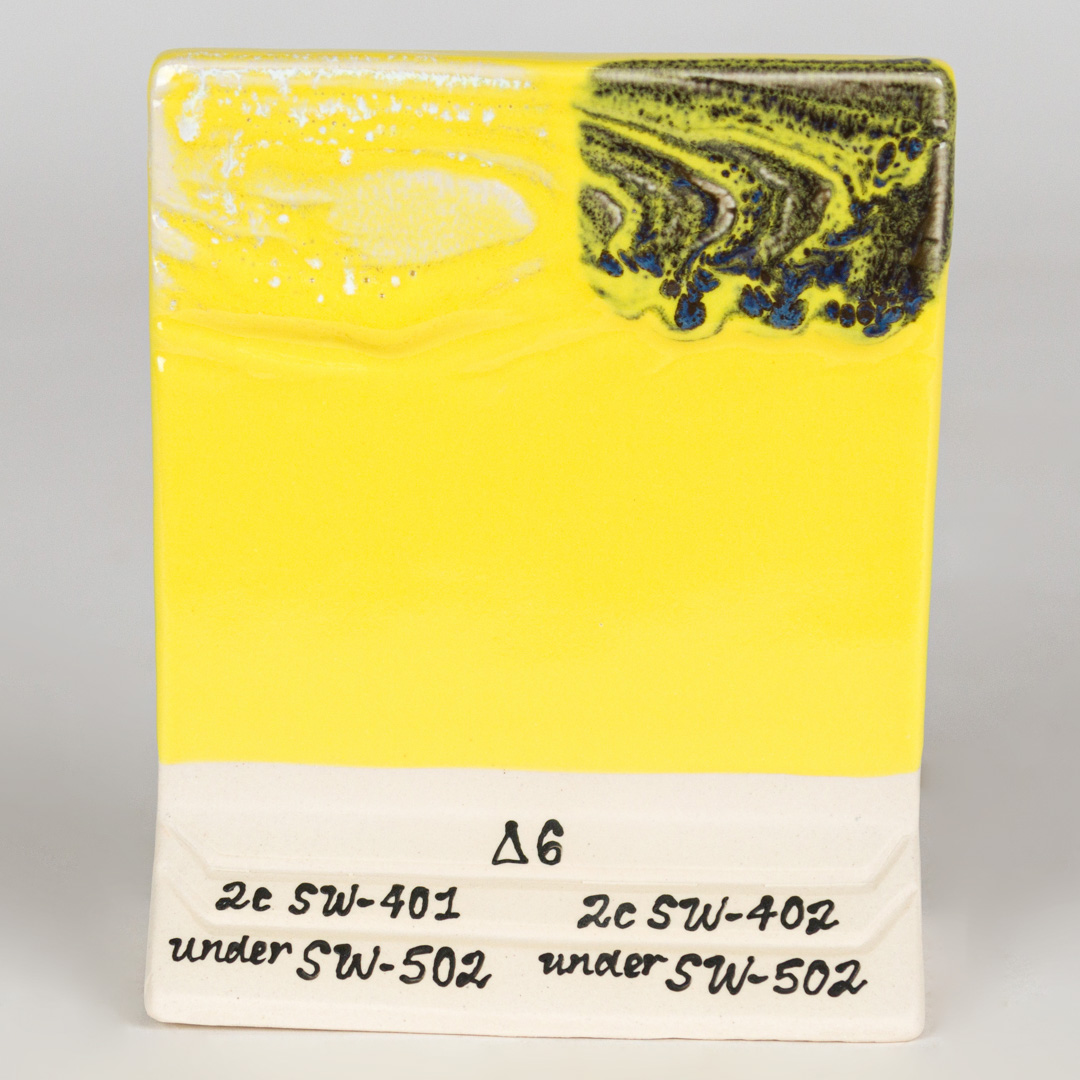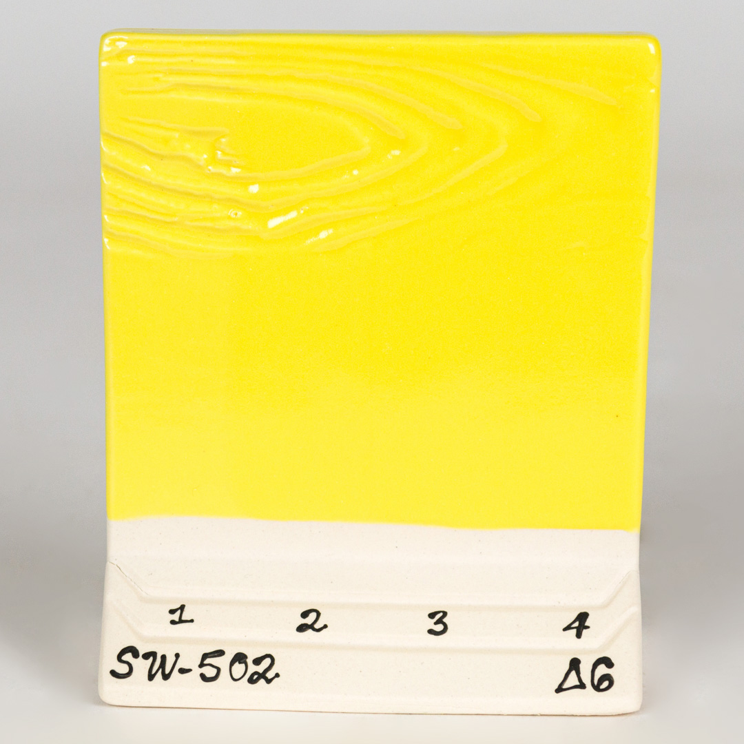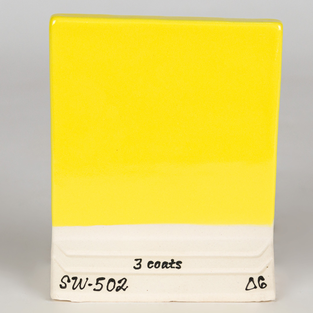 Cone 6 oxidation (larger image): Yellow Gloss is a highly-pigmented cheerful yellow glaze. The stable qualities of this glaze make it ideal for design work and full opaque coverage at mid-range temperatures.