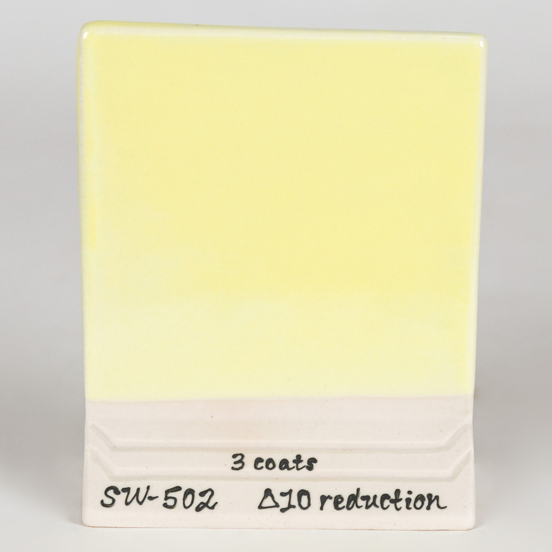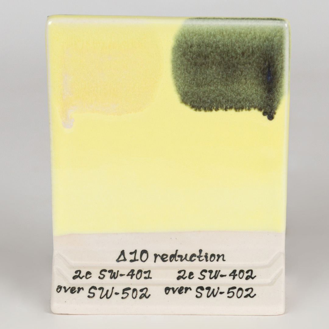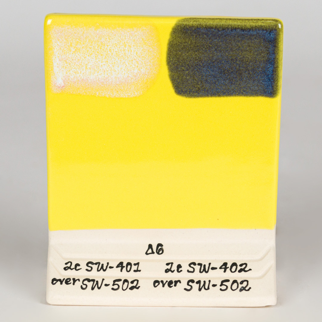 Cone 6 oxidation (larger image): Yellow Gloss is a highly-pigmented cheerful yellow glaze. The stable qualities of this glaze make it ideal for design work and full opaque coverage at mid-range temperatures.