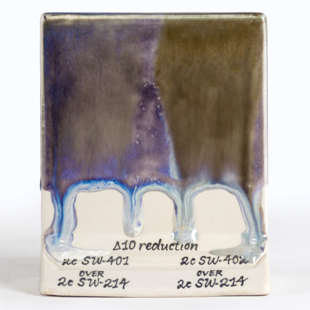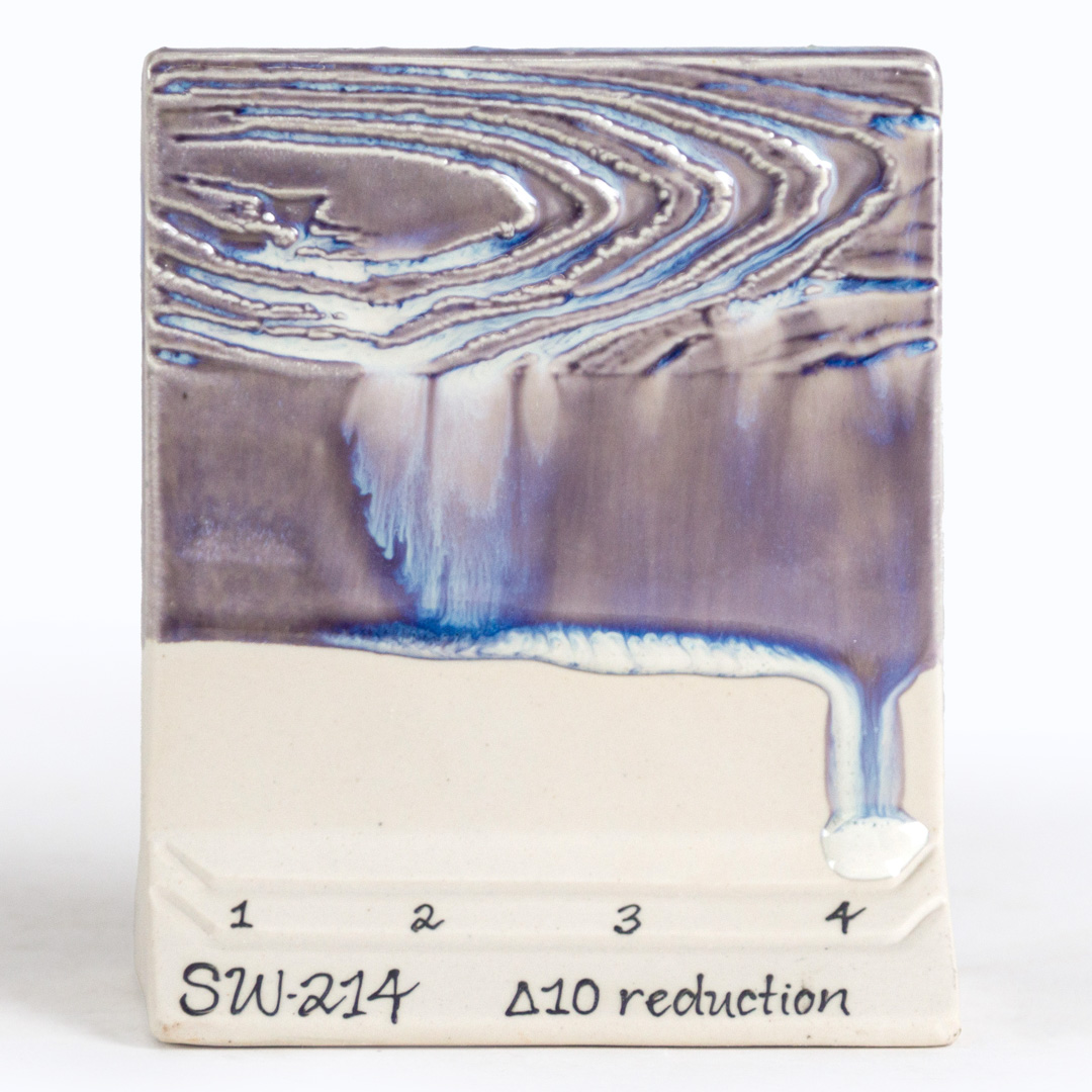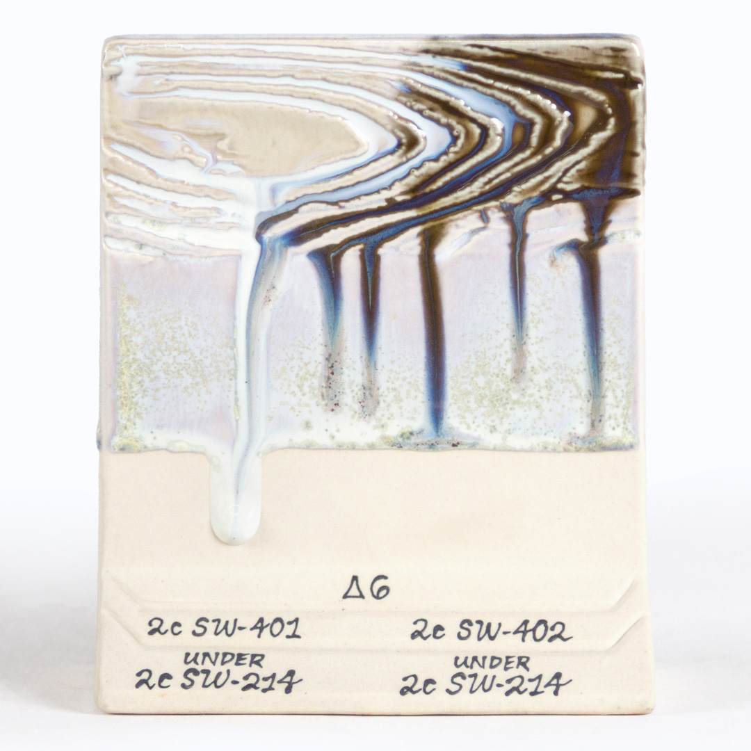 Chips shown are fired flat on a white clay body fired to cone 6 oxidation and cone 10 reduction. The choice of clay body, the thickness of glaze application, the firing process, and temperature will affect the fired results.