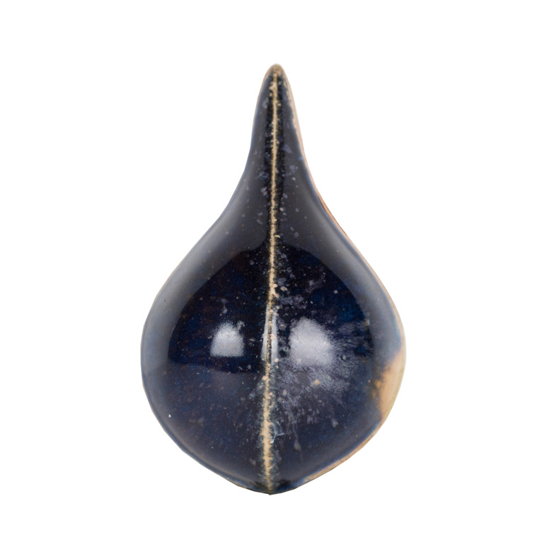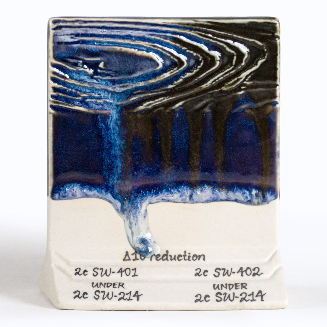 Cone 10 reduction (smaller image): Glaze darkens to blue, purple and white variegation.