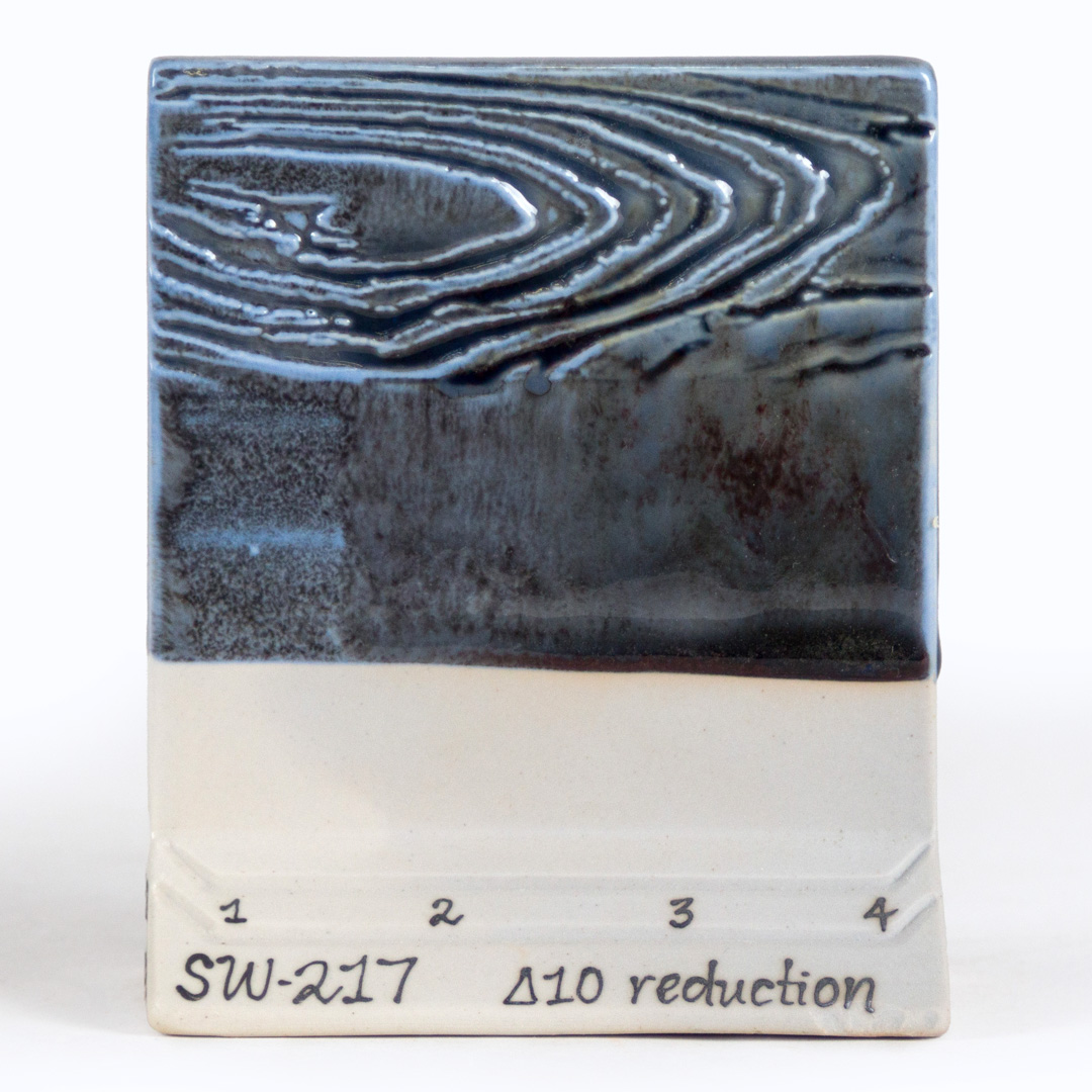 Cone 10 reduction (smaller image): Glaze turns to a variegated grey/blue.