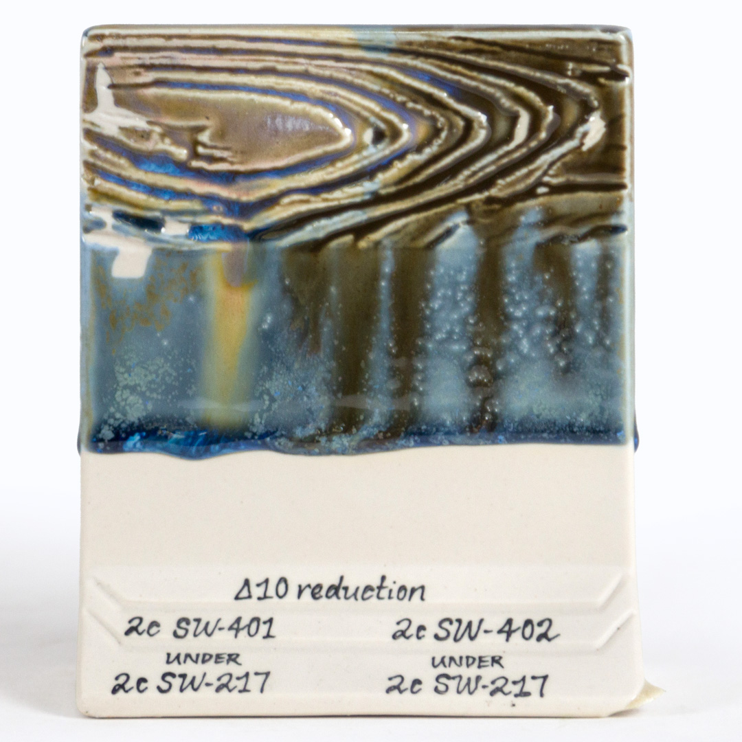 Chips shown are fired flat on a white clay body fired to cone 6 oxidation and cone 10 reduction. The choice of clay body, the thickness of glaze application, the firing process, and temperature will affect the fired results.