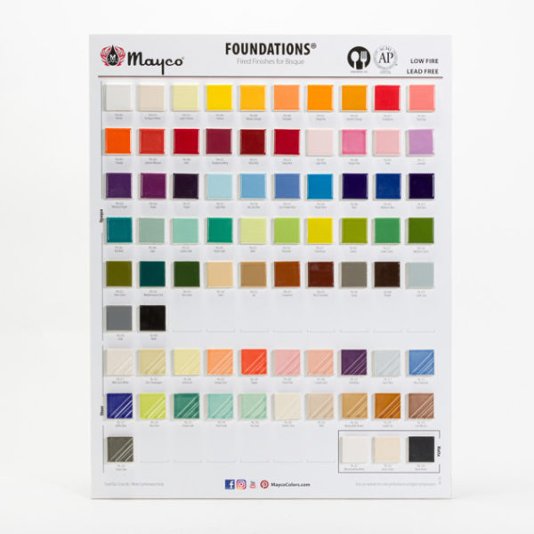 Includes Mayco’s Foundations opaque, sheer and matte glaze chips fired to cone 06.