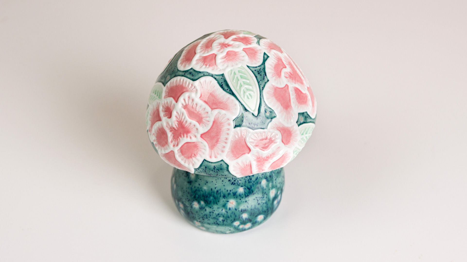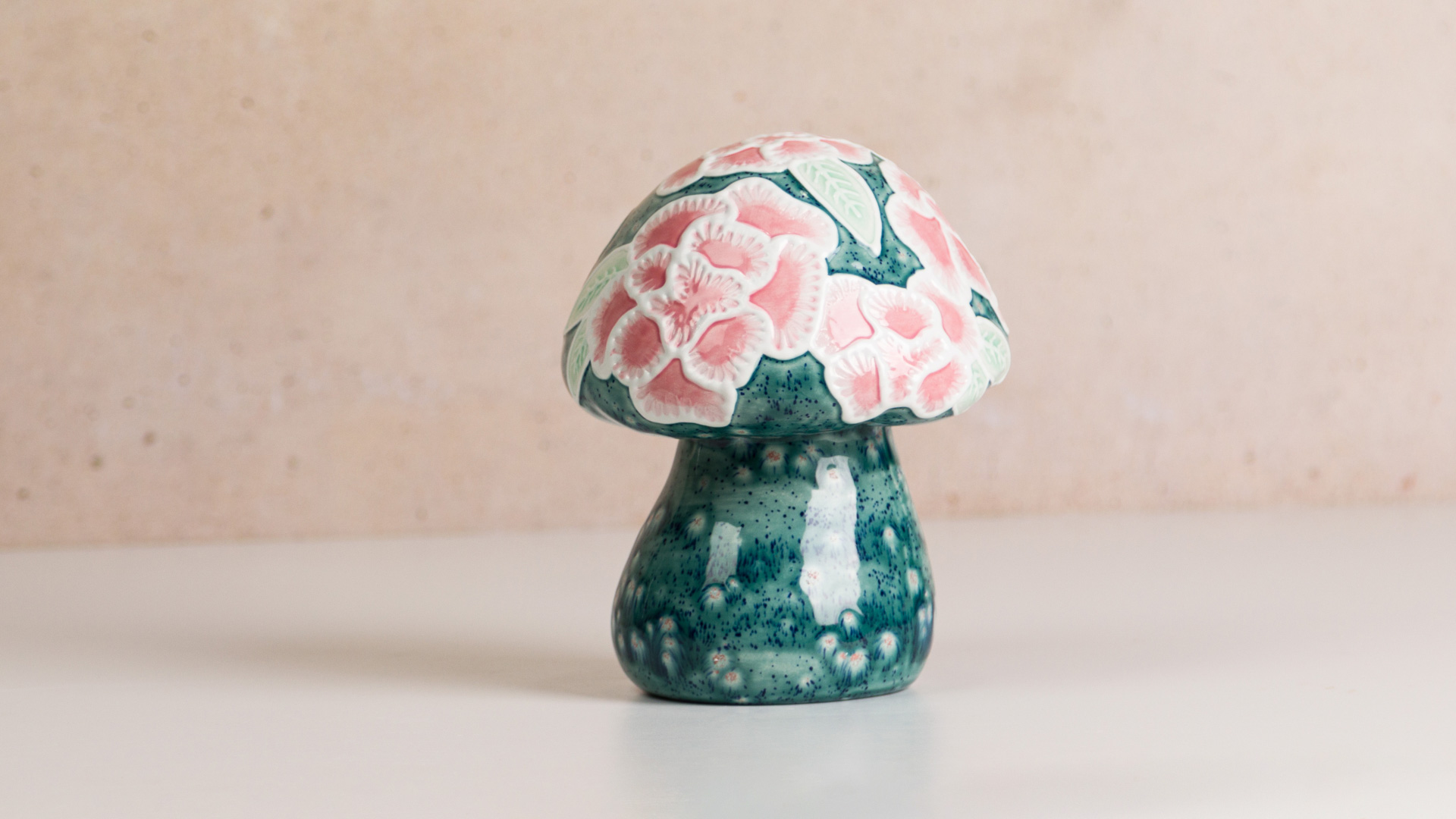 Apply three coats of CG974 Bloomin’ Blue around the flowers, leaves, and stem of the mushroom with the script liner, detail liner, and fan brushes.