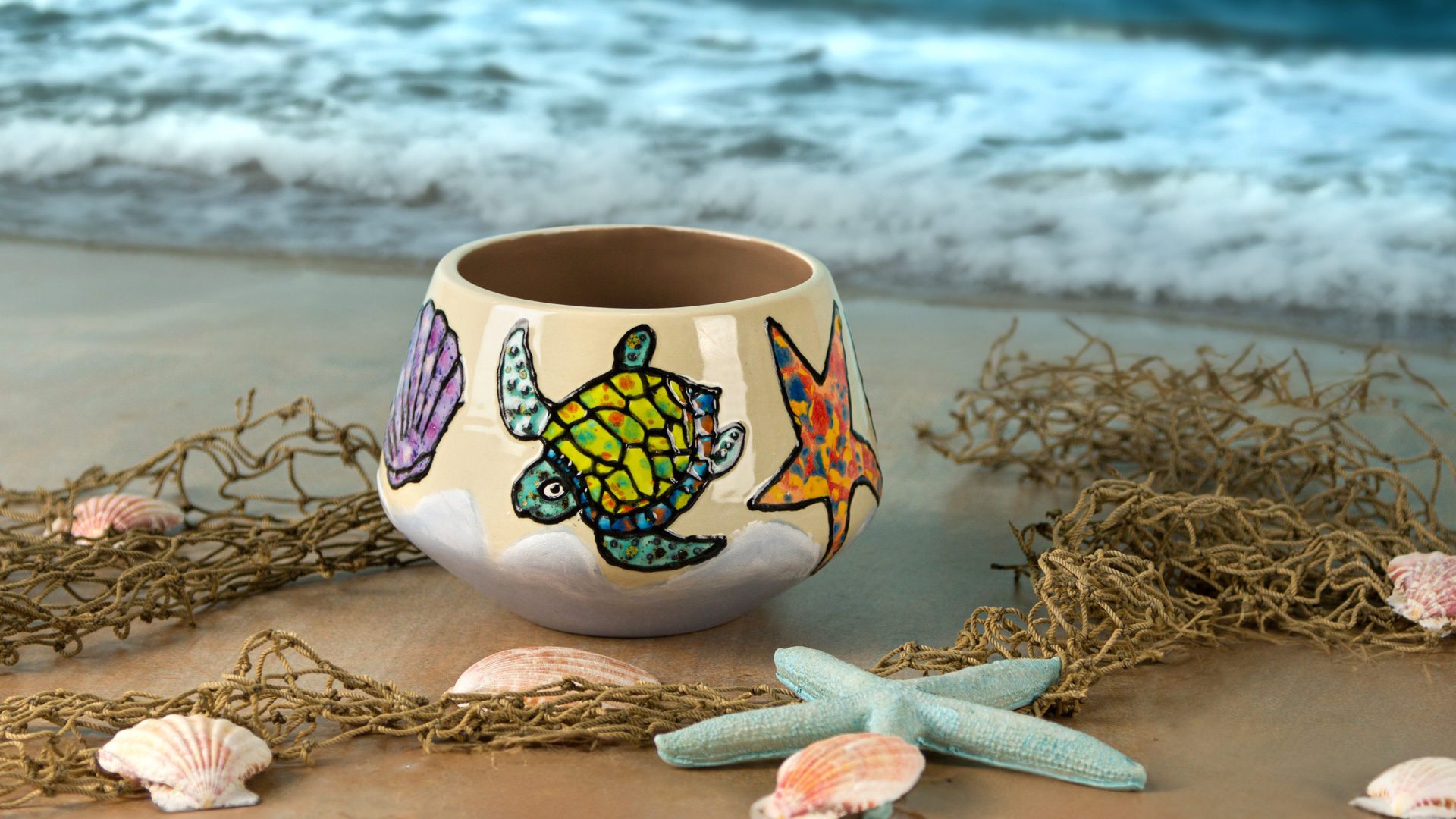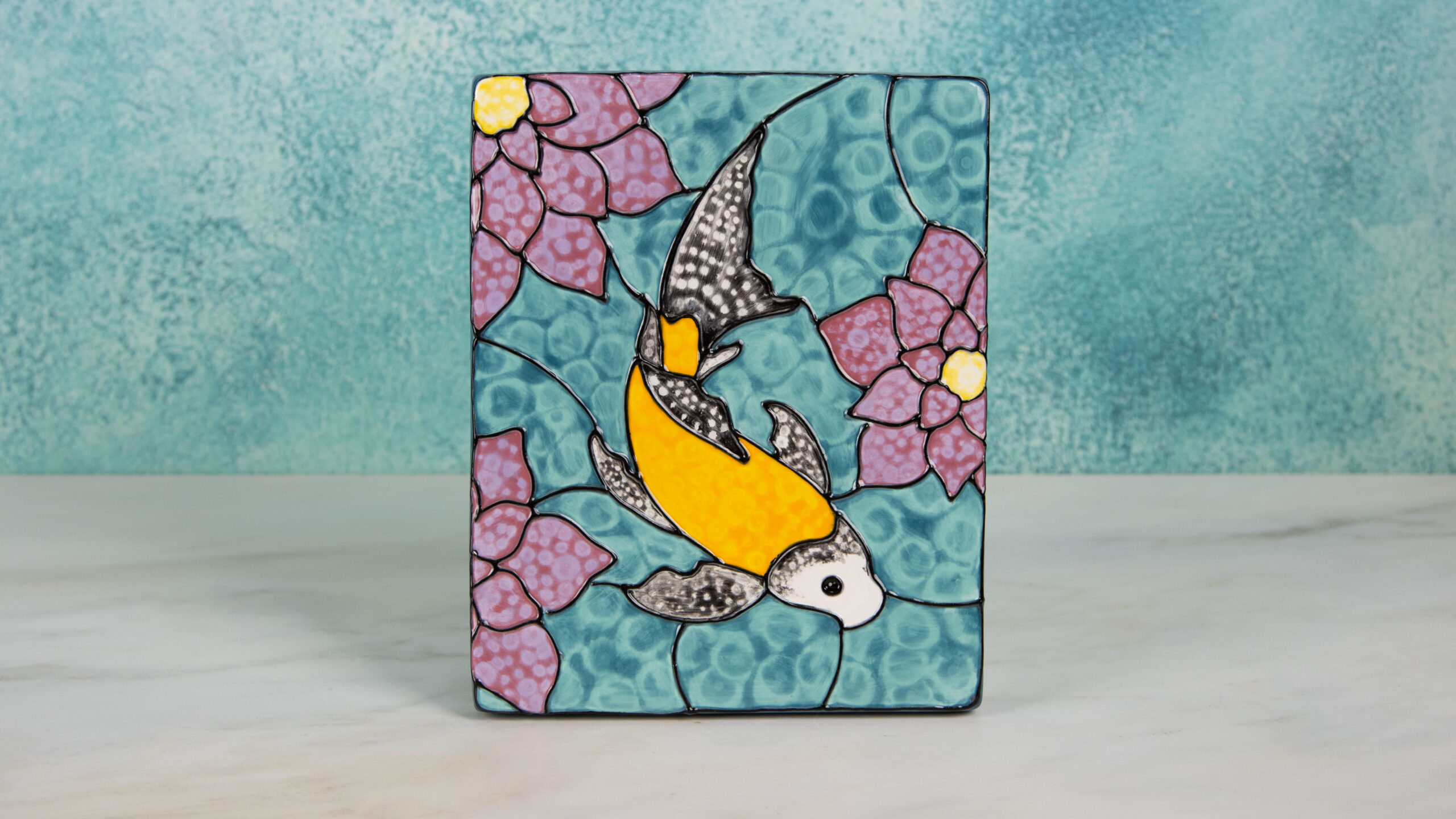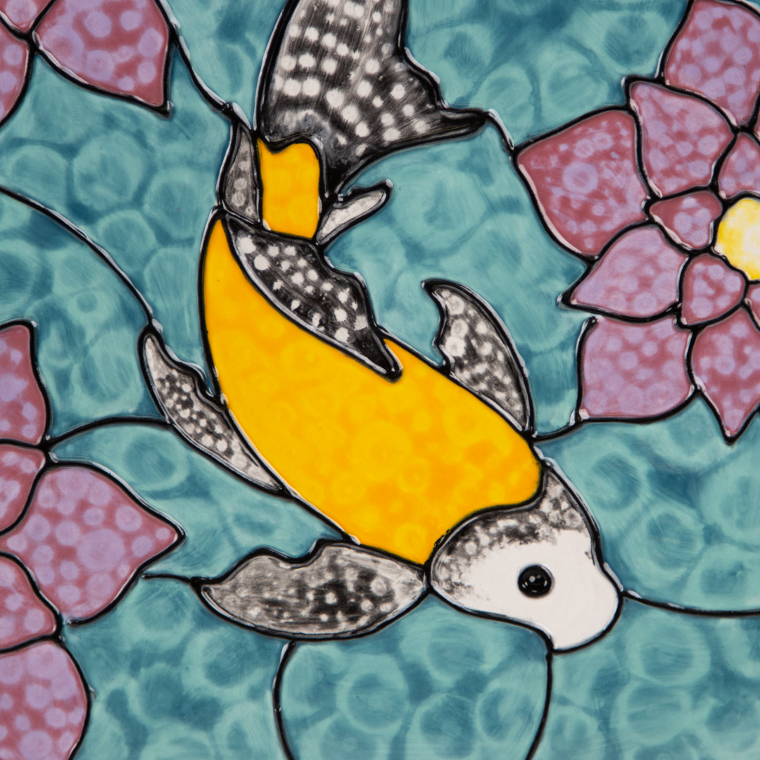 - After the canvas has dried, apply three coats of SC029 Bluegrass to the edges of the canvas using the soft fan brush. Allow to dry, stilt, and fire to cone 06.