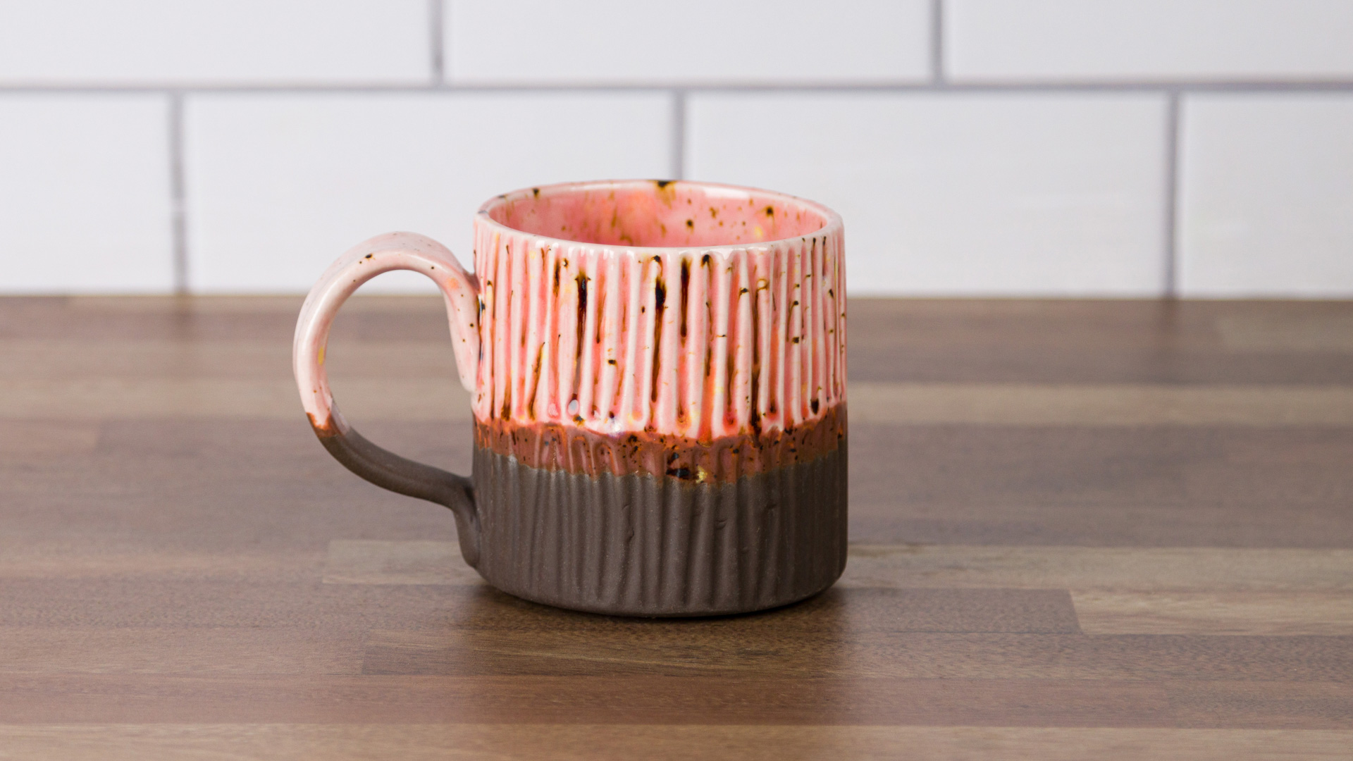 Using a #4 soft fan brush (RB144) apply 2 coats of EG004 Dark Brown Engobe to the bottom 2/3 of the mug and bottom 2/3 of handle.