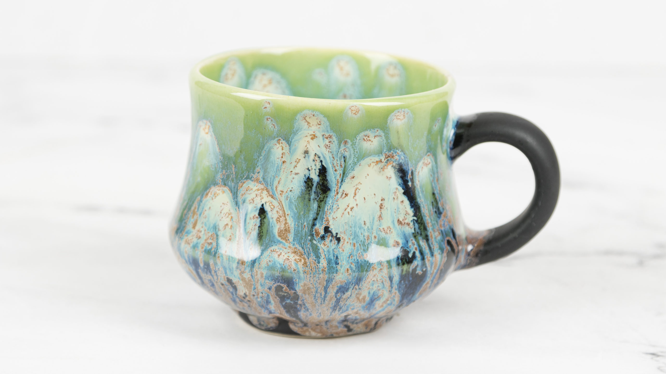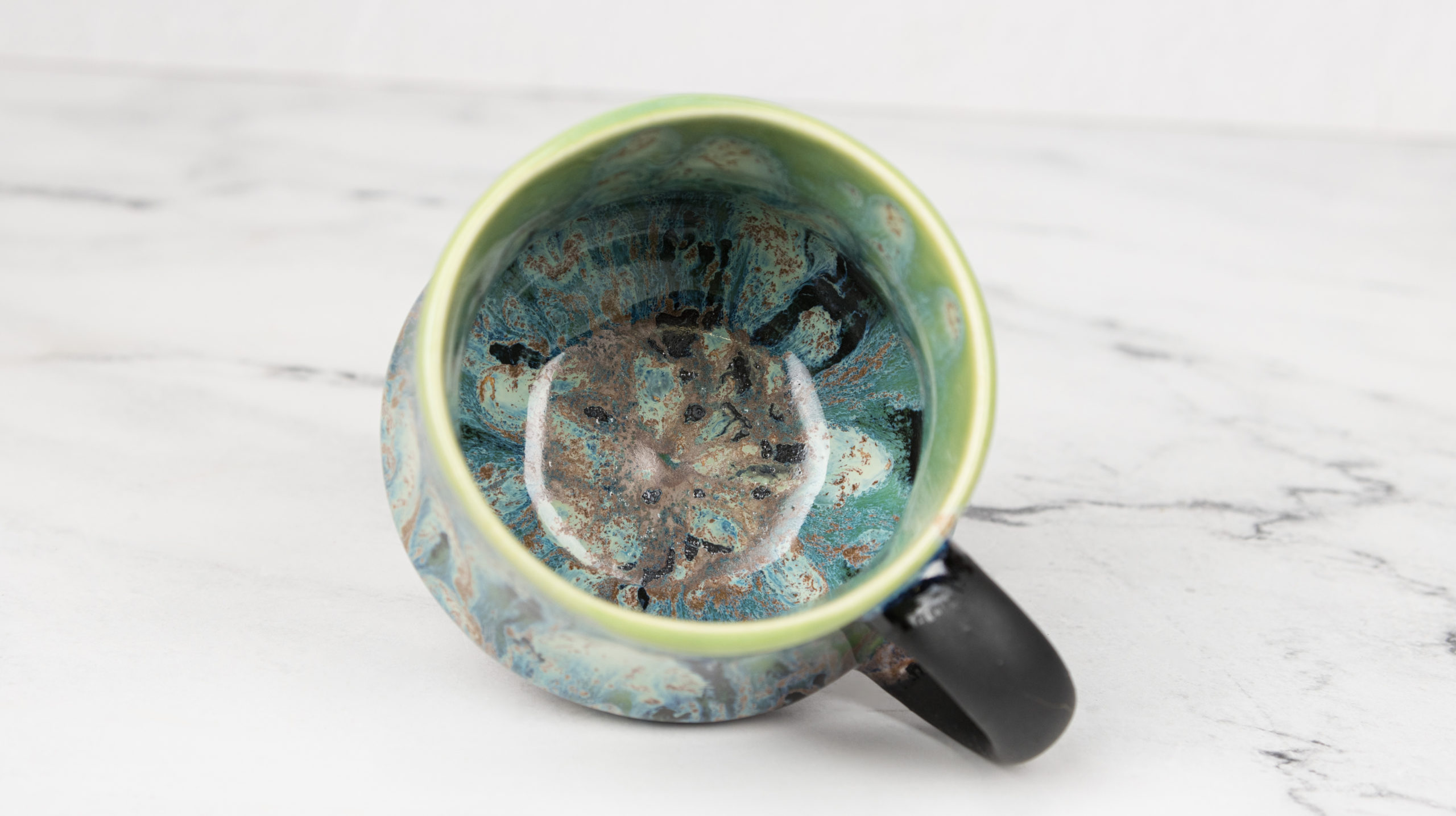 Use a soft fan to apply 2 coats of SW-146 Aurora Green to the top section and inside of the mug. Be sure to load it really well with crystals! These are what create the beautiful movement and variation in the combination.