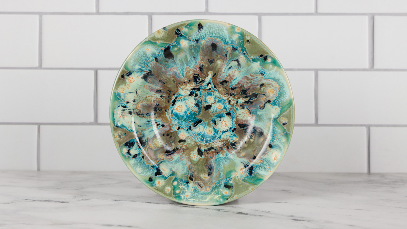 Use the Round Brush to apply ¼” of AC-302 Wax Resist around the outside bottom of the dish. Follow the instructions on the bottle for conditioning the brush prior to use. Wash brush immediately after use.
