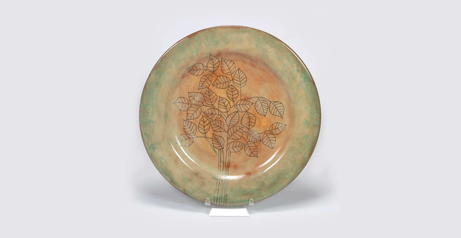 4. Using the Soft Fan with random brush strokes, apply two coats of EL-128 Wheat to the front of the plate, changing to EL-130 Sea Green when you reach the rim. Allow the colors to overlap.
