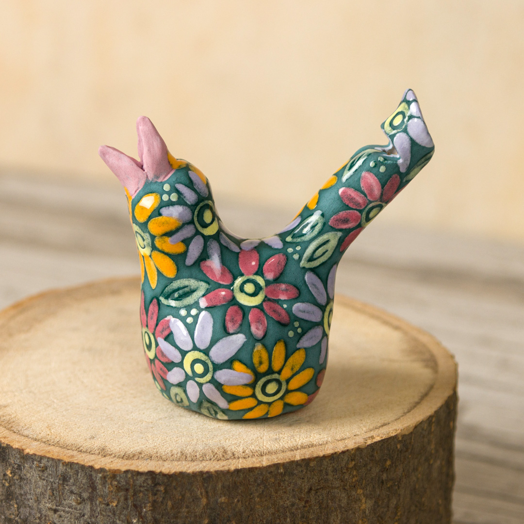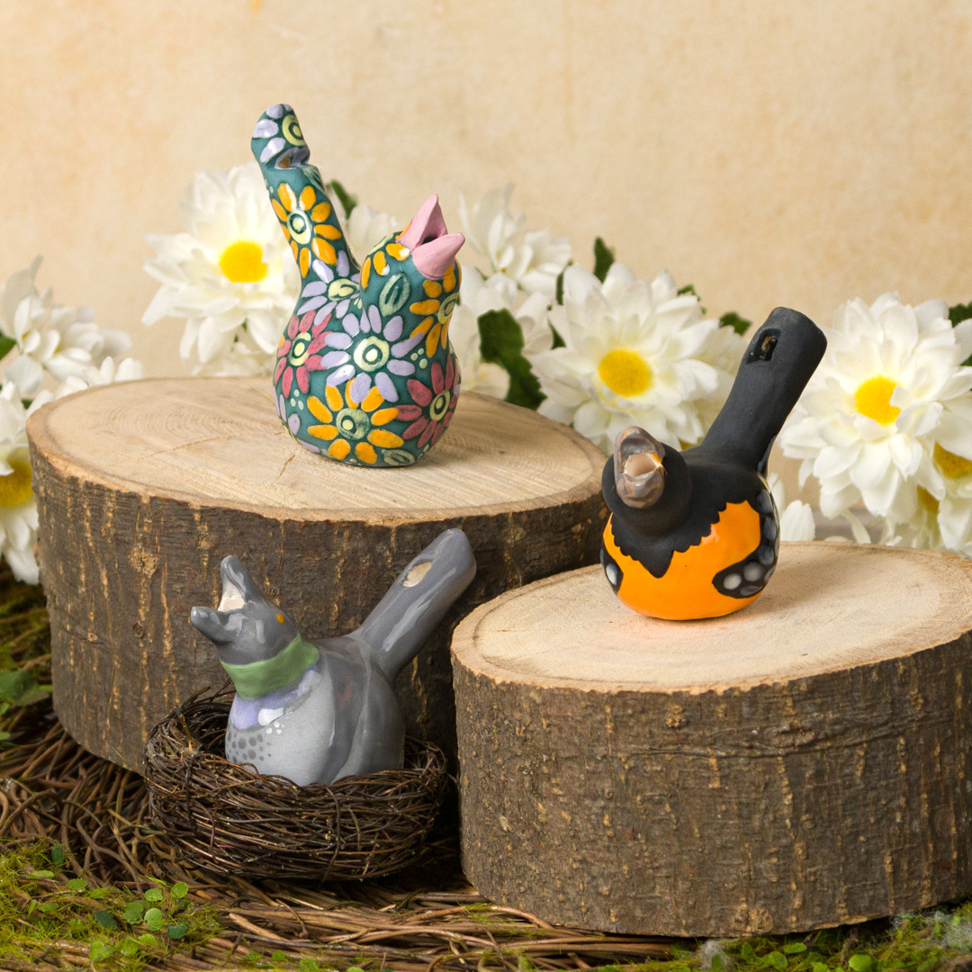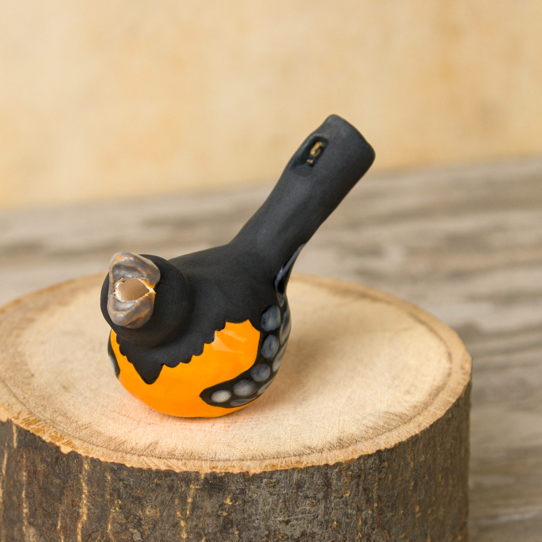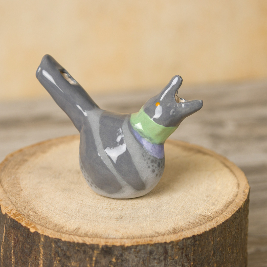 After firing, fill the whistle with water just to where the neck and tail pieces start to curve up. Blow into the mouthpiece to produce a burbling whistle! Note: The whistle is not water tight and the water will naturally evaporate out of the bird whistle over time.