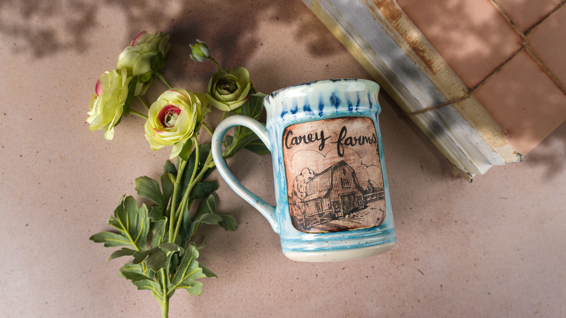 8. Using the Soft Fan with SW-166 Norse Blue, apply 2 coats to the outside of the mug. Do not glaze over the message section. Recede the 2nd coat around 1/4” from the bottom of the mug to prevent dripping. Allow glaze to dry between coats.