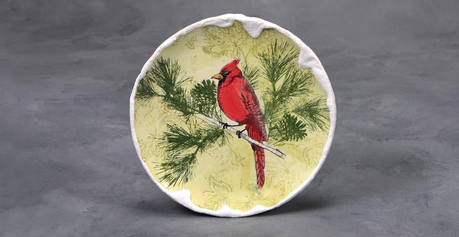 You will screen the cardinal design with clear glaze and food coloring for placement only; the food coloring will burn off during firing.