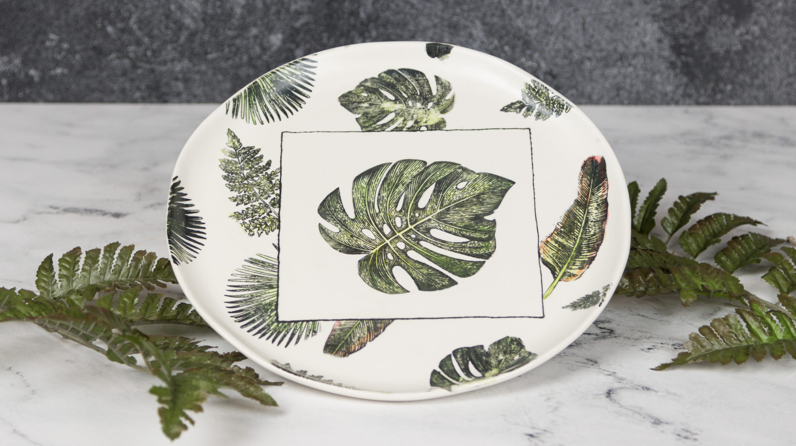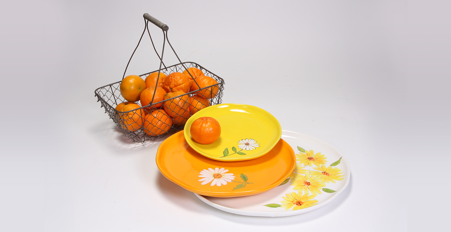 2. Use the Soft Fan to apply three coats of FN-003 Yellow onto the salad plate. Apply three coats of FN-052 Tangerine to the dinner plate and and three coats of FN-001 White to the charger. Let dry.