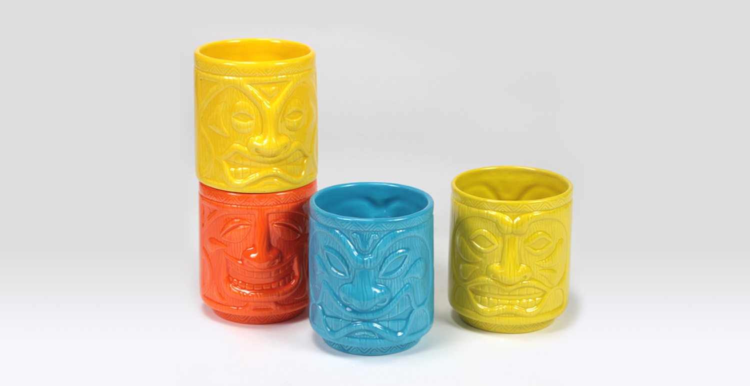 Use the Soft Fan to apply three coats of the following colors to each of the Tiki Mugs: SC-6 Sunkissed, SC-11 Blue Yonder, SC-75 Orange-A-Peel, SC-77 Glo-Worm.