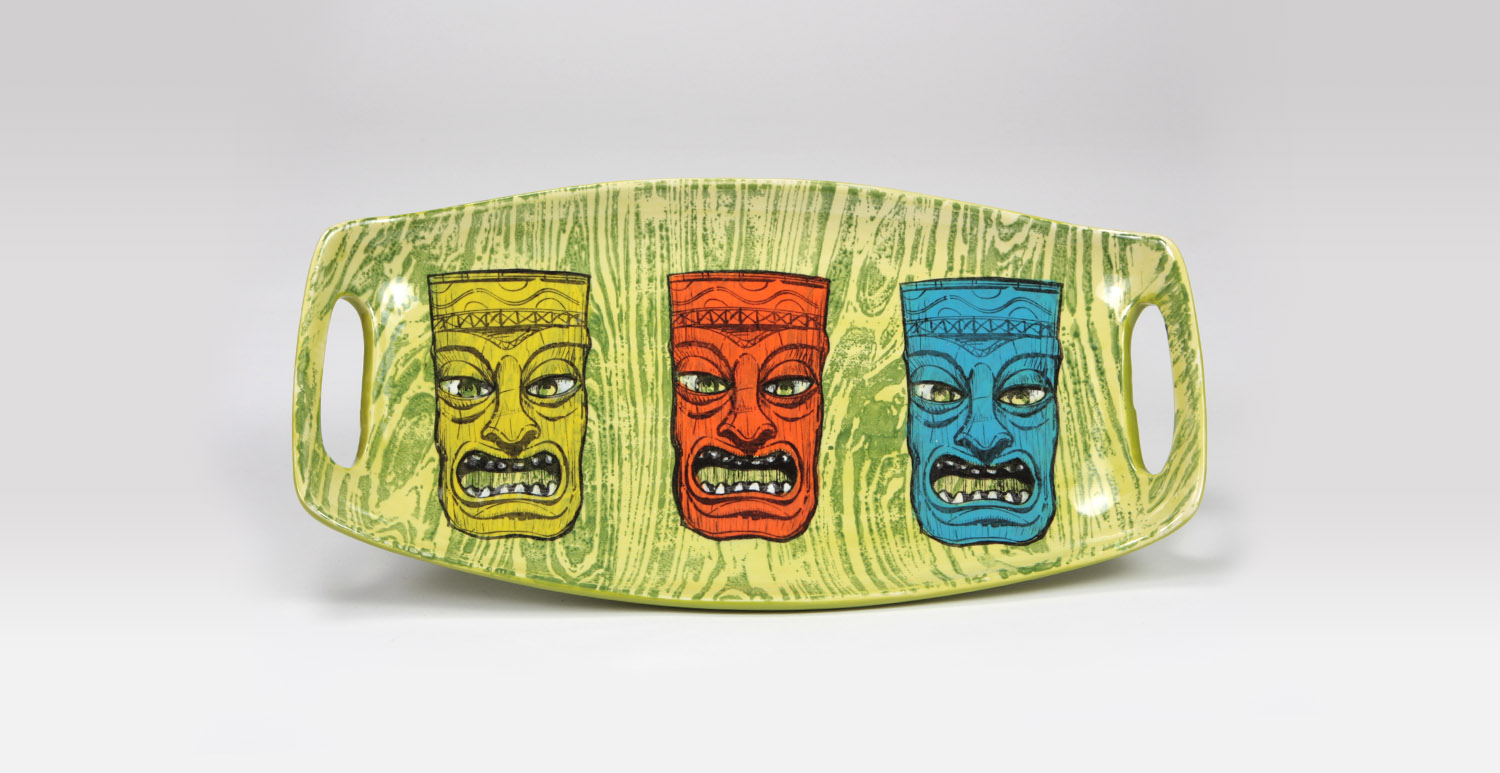 4. Thicken S-2101 Clear with AC-310 Silkscreen Medium and use a palette knife mix to the consistency of peanut butter. Add a few drops of food coloring to tint the mixture. Starting at the center of the tray, place the tiki mask from DSS-0147 Island (shiny side down) onto the center of the tray. Rub mixture over the screen. This is for color placement only. Repeat on each side of this image for the other masks.