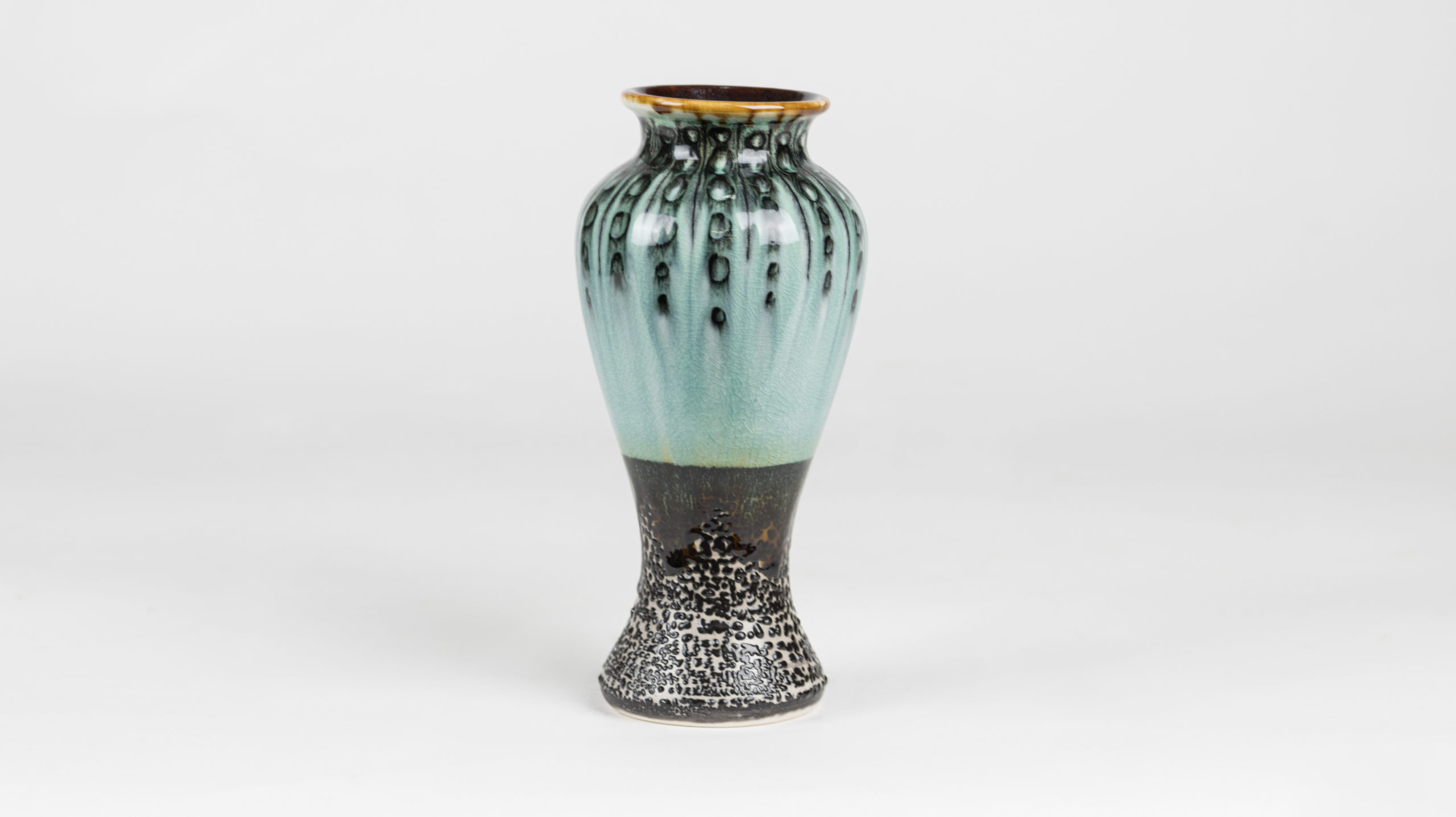 Use a fan brush to apply 3 coats of CC-108 China Sea to the top section of the vase.