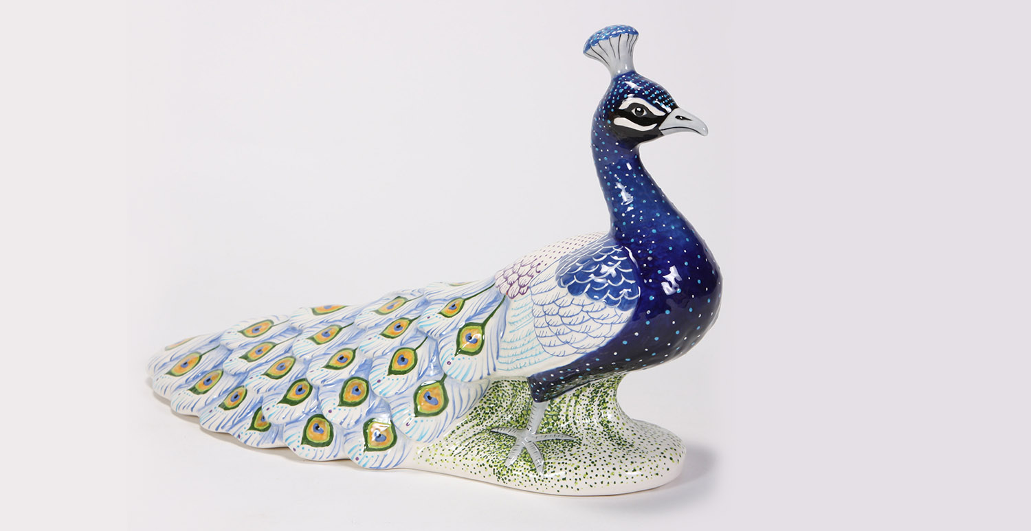 4. Using the Detail Liner with SC-15 Tuxedo, apply 1 coat around the eye areas of the peacock. While it is still wet, use the Script Liner with SC-76 Cara-Bein Blue and SC-13 Moody Blue to shade the head, neck and front. Repeat when dry.
