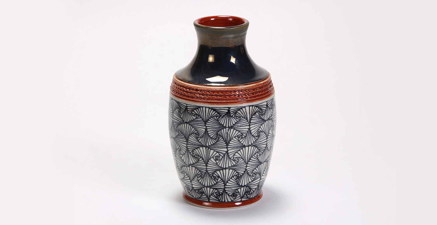 Apply 2-3 coat of SW-119 Cinnabar to the base and textured area. Roll the glaze on the inside of the vase