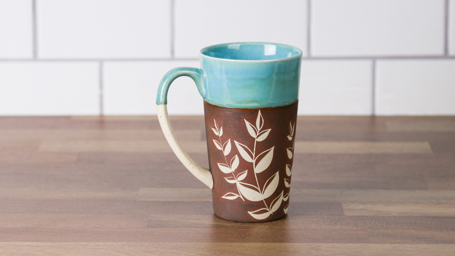 If using a vinyl resist, apply 3 coats of SW172 Macadamia over entire Engobe. Remove resist before the Engobe dries completely prior to firing. Do not fire with vinyl resist left on mug.