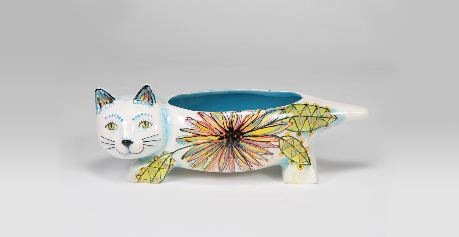 Two medium-size flowers are on the back of the cat along with two leaves.