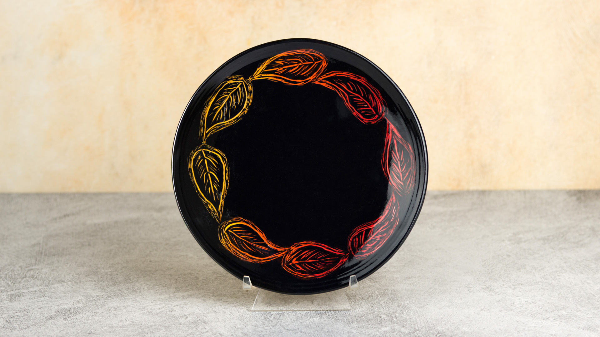 Apply EG006 Sparkle Black Engobe to the back of the plate. Apply 3 coats using a RB140 Soft Fan. Wait for it to dry until the shine is gone and use a paper towel to softly rub the surface to let the sparkles come though.