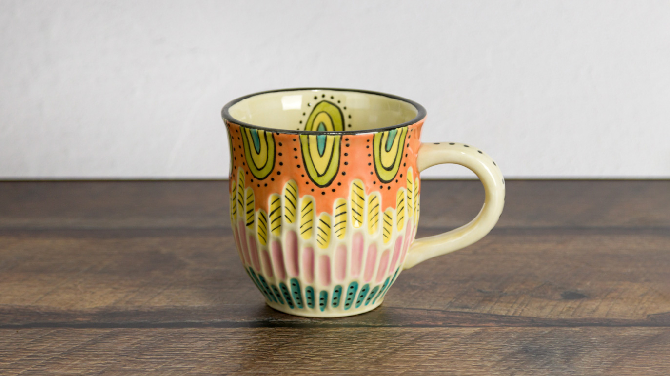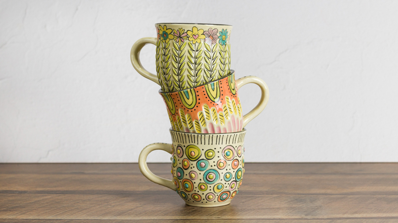 Using the Detail Liner with SC-52 Toad-ily Green, SC-28 Blue Isle, SC-42 Butter Me Up, SC-50 Orange Ya Happy and SC-70 Pink-A-Dot, apply 2 coats in a circular shape around 1/3 of the circles on the mug. Pick a different color from previous circle.