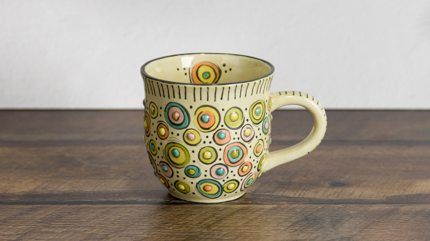 Use the pencil to sketch 3 concentric circles on the inside of the mug